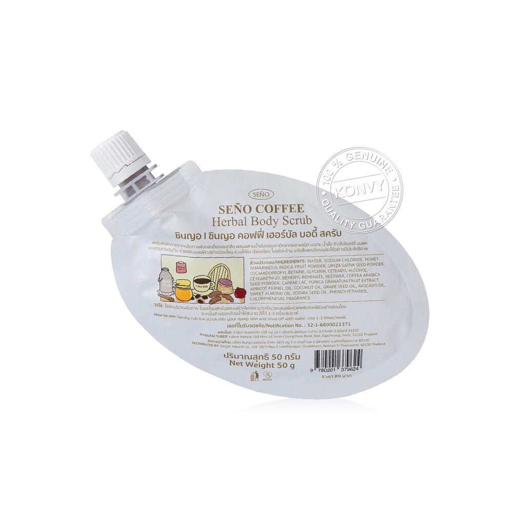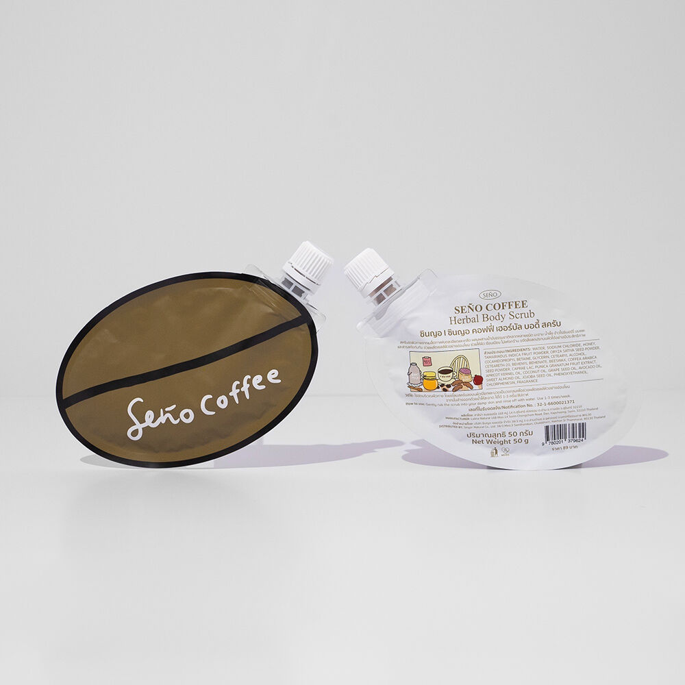Seno Coffee Herbal Body Scrub 50g สครับขัดผิวกาย สูตรเข้มข้นจากเมล็ดกาแฟบดละเอียดและเกลือ ผสมผสานน้ำมันธรรมชาติหลากหลายชนิด มะขาม น้ำผึ้ง ข้าวไรซ์เบอร์รี่ นมแพะ และสารสกัดทับทิม ช่วยผลัดเซลล์ผิวอย่างอ่อนโยน เติมความชุ่มชื้น ช่วยให้ผิวเรียบเนียน ไม่แห้งกร้าน ขจัดสิ่งสกปรกบนผิวได้อย่างมีประสิทธิภาพ เผยผิวใหม่ที่เนียนนุ่มสุขภาพดี