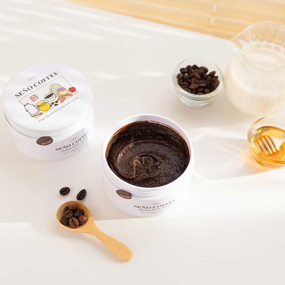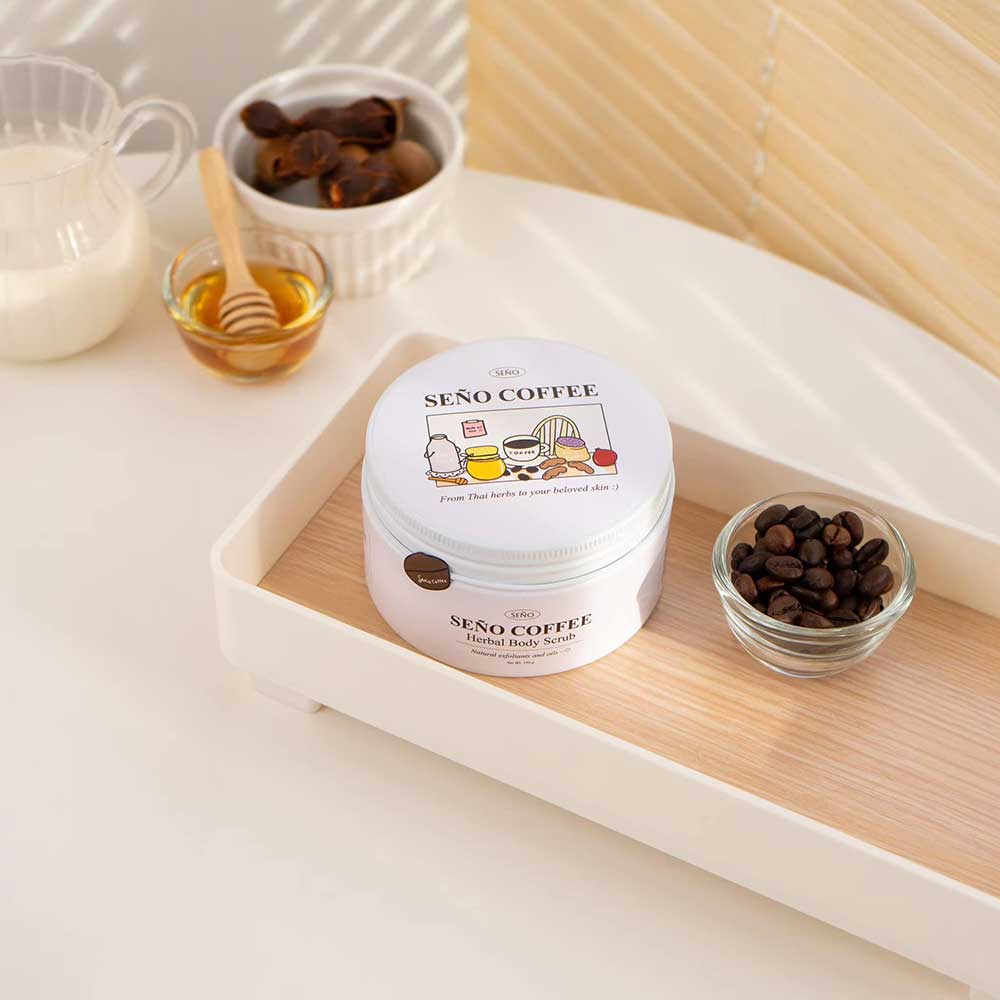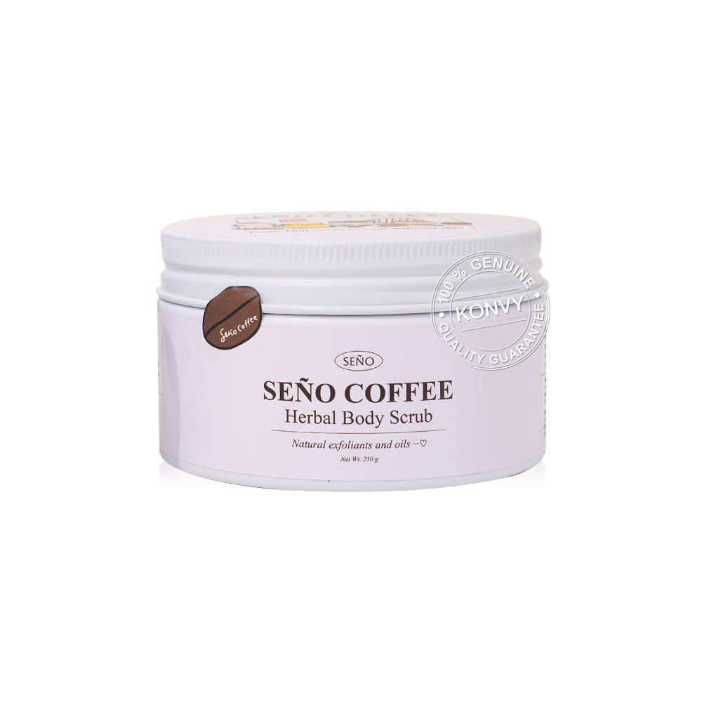 Seno Coffee Herbal Body Scrub 250g สครับขัดผิวกายสูตรเข้มข้นจากเมล็ดกาแฟบดละเอียดและเกลือ ผสมผสานน้ำมันธรรมชาติหลากหลายชนิด มะขาม น้ำผึ้ง ข้าวไรซ์เบอร์รี่ นมแพะ และสารสกัดทับทิม ช่วยผลัดเซลล์ผิว ขจัดสิ่งสกปรกอย่างอ่อนโยน พร้อมเติมความชุ่มชื้น ให้ผิวเรียบเนียน ไม่แห้งกร้าน เผยผิวเนียนนุ่มสุขภาพดี
