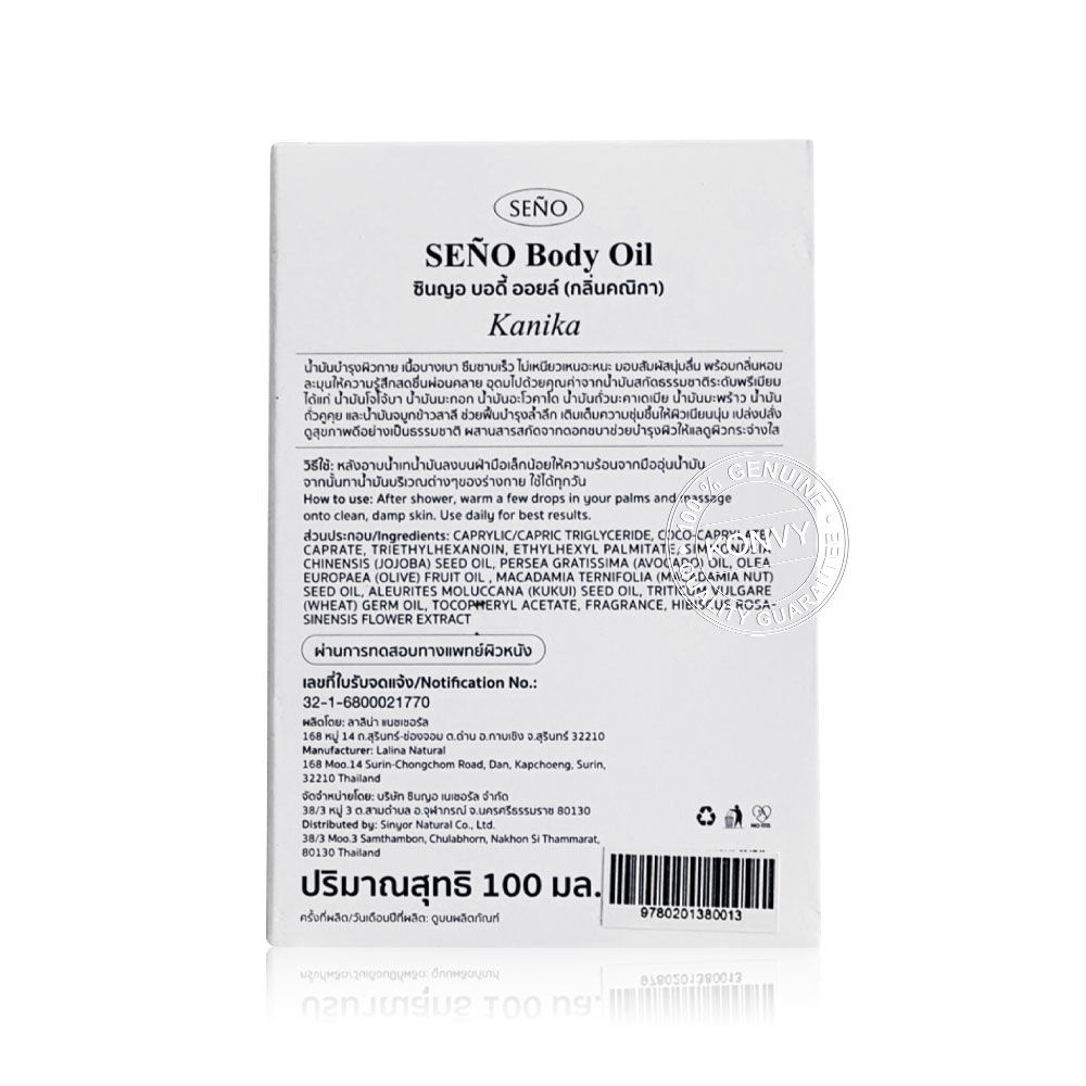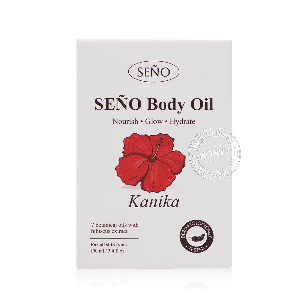 Seno Body Oil 100ml #Kanika น้ำมันบํารุงผิวกาย เนื้อบางเบา ซึมซาบเร็ว ไม่เหนียวเหนอะหนะ มอบสัมผัสนุ่มลื่น พร้อมกลิ่นหอมละมุนสไตล์ไทยๆ มีสารสกัดจากดอกชบาช่วยผลัดเซลล์ผิว ให้ผิวกระจ่างใสเนียนนุ่ม และช่วยปลอบประโลมบํารุงผิว อุดมไปด้วยคุณค่าจากน้ำมันสกัดธรรมชาติระดับพรีเมียม ได้แก่ น้ำมันโจโจ้บา น้ำมันมะกอก น้ำมันอะโวคาโด น้ำมันถั่วแมคคาเดเมีย น้ำมันมะพร้าว น้ำมันถั่วคูคุย และน้ำมันจมูกข้าวสาลี ช่วยฟื้นบํารุงผิวอย่างล้ำลึก เติมเต็มความชุ่มชื้นให้ผิวเนียนนุ่ม เปล่งปลั่ง ดูสุขภาพดีอย่างเป็นธรรมชาติ
