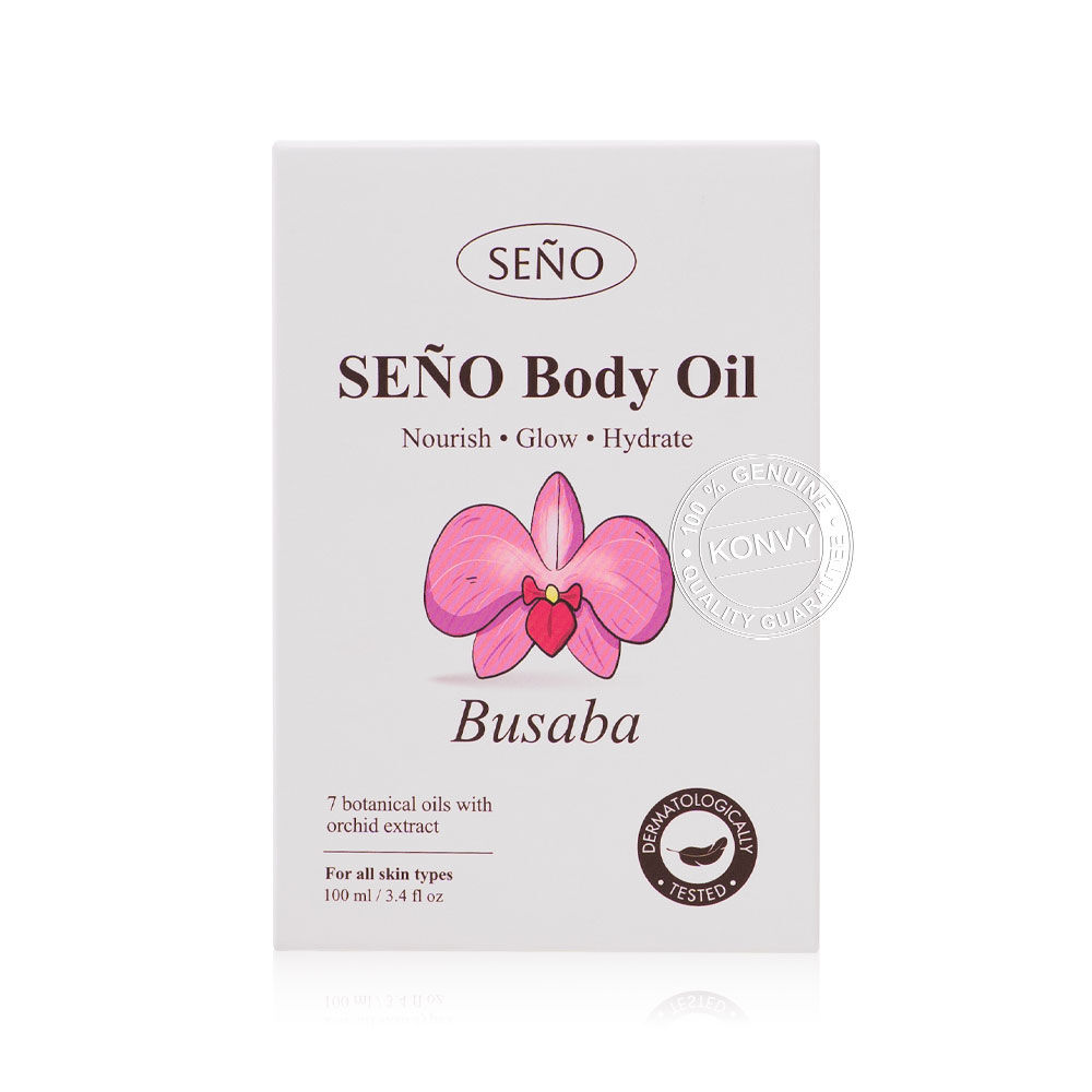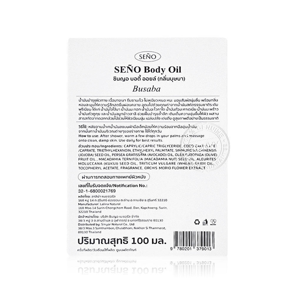 Seno Body Oil 100ml #Busaba น้ำมันบํารุงผิวกาย เนื้อบางเบา ซึมซาบเร็ว ไม่เหนียวเหนอะหนะ มอบสัมผัสนุ่มลื่น พร้อมกลิ่นหอมสดชื่น มีสารสกัดจากดอกกล้วยไม้ไทย ช่วยฟื้นฟูและบำรุงผิวอย่างล้ำลึก และช่วยปลอบประโลมบํารุงผิว อุดมไปด้วยคุณค่าจากน้ำมันสกัดธรรมชาติระดับพรีเมียม ได้แก่ น้ำมันโจโจ้บา น้ำมันมะกอก น้ำมันอะโวคาโด น้ำมันถั่วแมคคาเดเมีย น้ำมันมะพร้าว น้ำมันถั่วคูคุย และน้ำมันจมูกข้าวสาลี ช่วยฟื้นบํารุงผิวอย่างล้ำลึก เติมเต็มความชุ่มชื้นให้ผิวเนียนนุ่ม เปล่งปลั่ง ดูสุขภาพดีอย่างเป็นธรรมชาติ