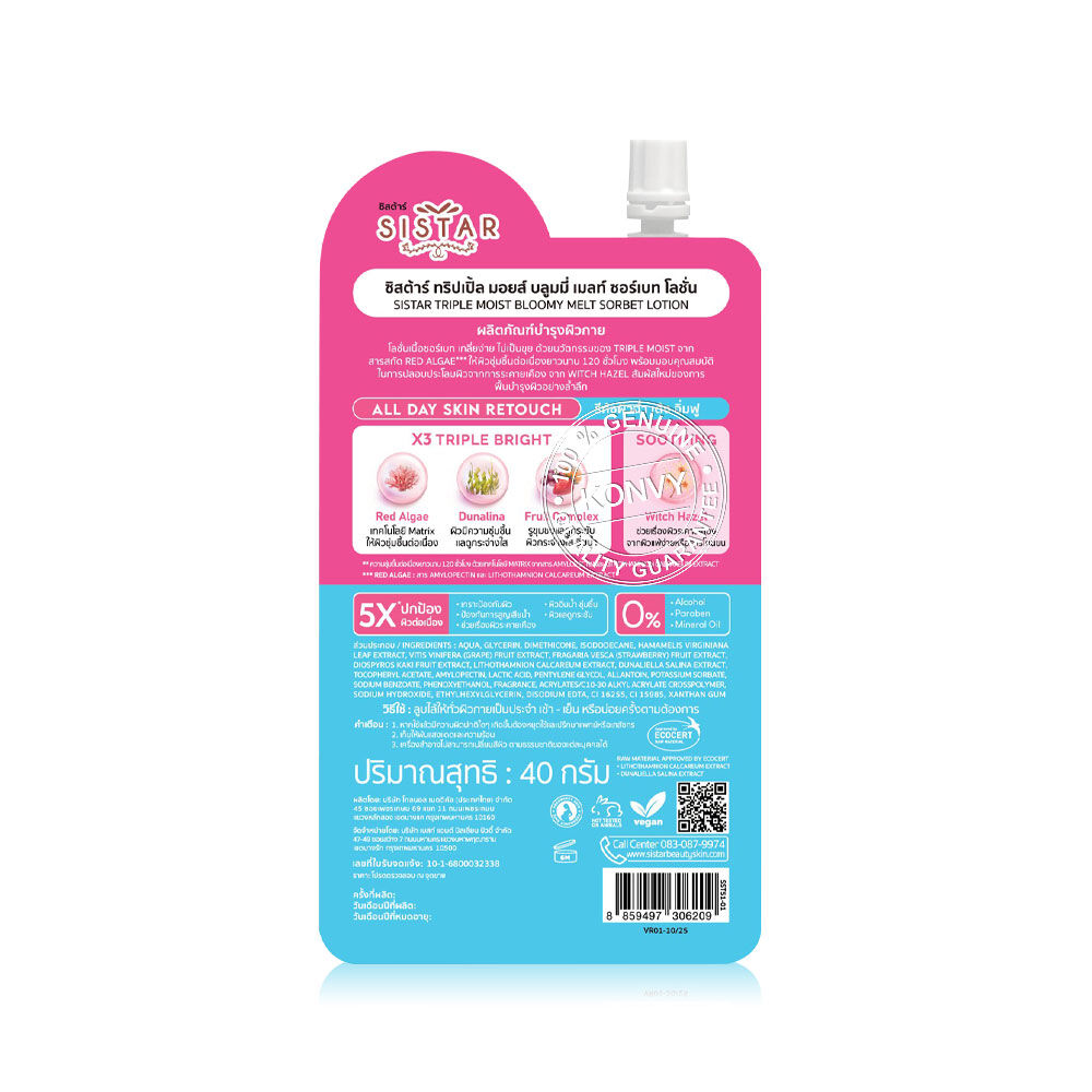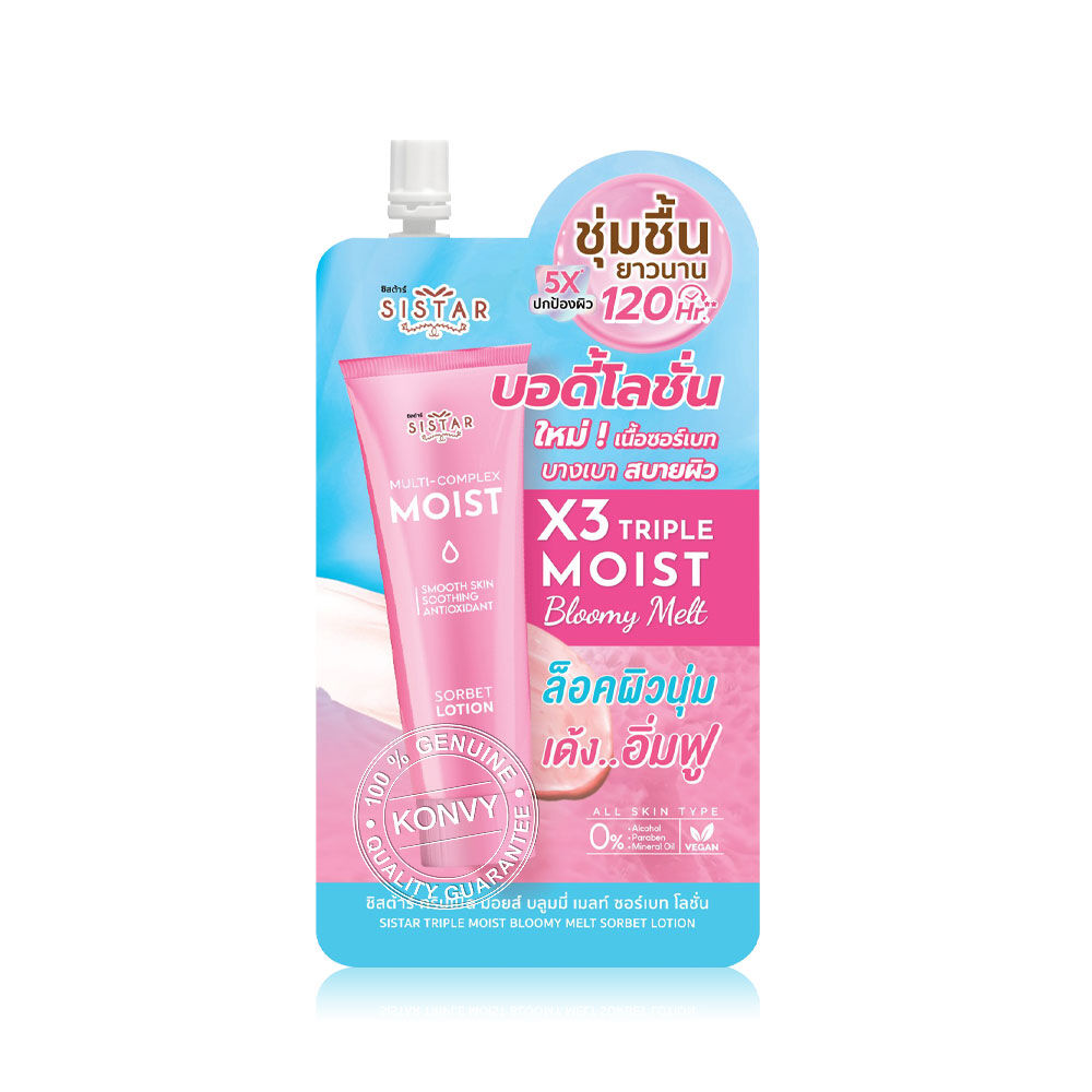 Sistar Triple Moist Bloomy Melt Sorbet Lotion 40g โลชั่นบำรุงผิวกายเนื้อซอร์เบท บางเบาสบายผิว เกลี่ยง่าย ไม่เป็นขุย ด้วยนวัตกรรม Triple Moist ผสานสารสกัดจาก Red Algae, Dunalina และ Fruit Complex ช่วยเติมความชุ่มชื้นให้ผิวยาวนาน และให้ผิวแลดูกระจ่างใสขึ้น พร้อมด้วย Witch Hazel ช่วยฟื้นบำรุงผิวอย่างล้ำลึก และปลอบประโลมผิว เผยผิวนุ่มเด้ง ดูอิ่มน้ำ สุขภาพดี