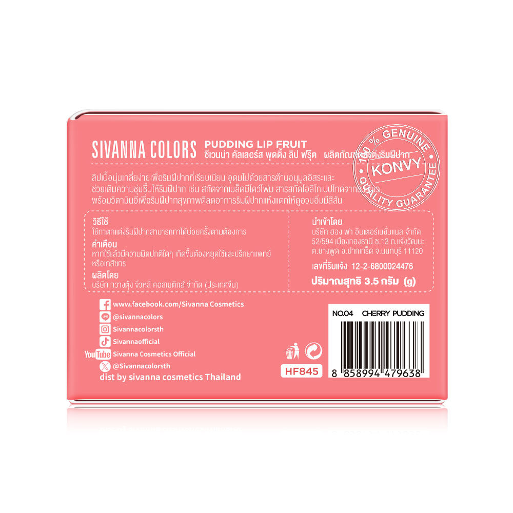 SIVANNA Colors Pudding Lip Fruit HF845 4g #04 ลิปพุดดิ้งเนื้อนุ่ม เกลี่ยง่าย เพื่อริมฝีปากที่เรียบเนียน พร้อมช่วยเติมความชุ่มชื้นให้ริมฝีปาก ด้วยสารสกัดจากเมล็ดมีโดว์โฟม โอลิโกเปปไทด์จากชาเขียว พร้อมวิตามินอีเพื่อริมฝีปากสุขภาพดี ลดอาการริมฝีปากแห้งแตกให้ดูอวบอิ่มมีสีสัน