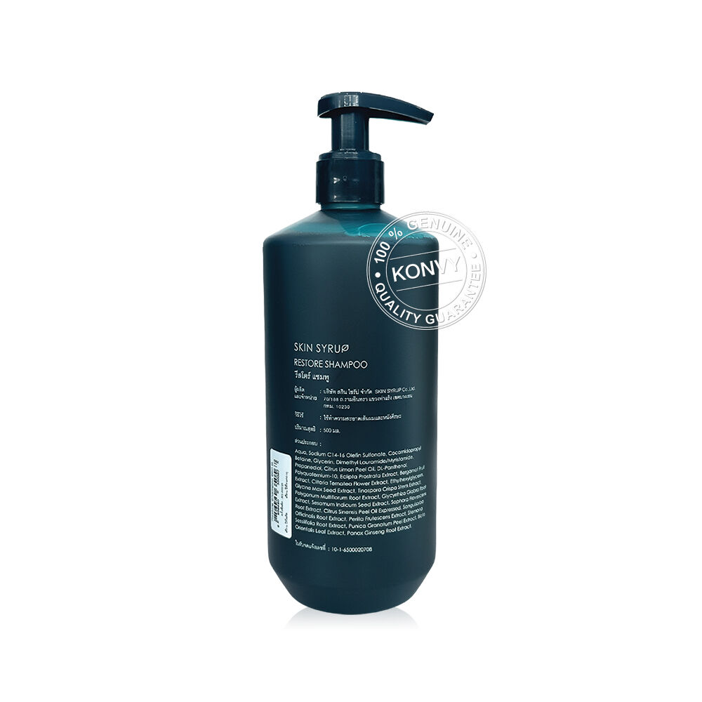 SKIN SYRUP Restore Shampoo 500ml แชมพูปรับสมดุลหนังศีรษะ ด้วยสารสกัดจากธรรมชาติ ช่วยทำความสะอาดเส้นผมและหนังศีรษะอย่างอ่อนโยน คืนสมดุลให้กับเส้นผมและหนังศีรษะ เสริมสร้างความแข็งแรง ลดอาการผมร่วงจากต้นเหตุ ด้วยการเพิ่มออกซิเจนให้รากผม ช่วยทำให้รากผมลำเลียงสารอาหารได้เต็มเป็นส่วนช่วยให้ผมขึ้นได้อย่างแข็งแรง ลดอาการคันและความมันจากภาวะหนังศีรษะไม่สมดุล พร้อมชะล้างสารเคมีตกค้างที่อุดตันตามรูขุมขนบนหนังศีรษะ ช่วยฟื้นฟูสภาพผมให้แข็งแรงและสุขภาพดีจากรากถึงปลายเส้นผม