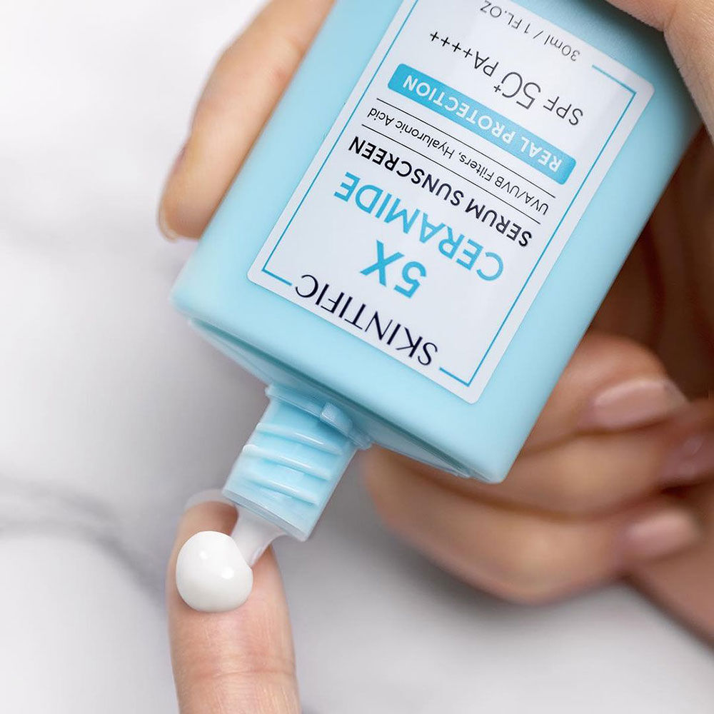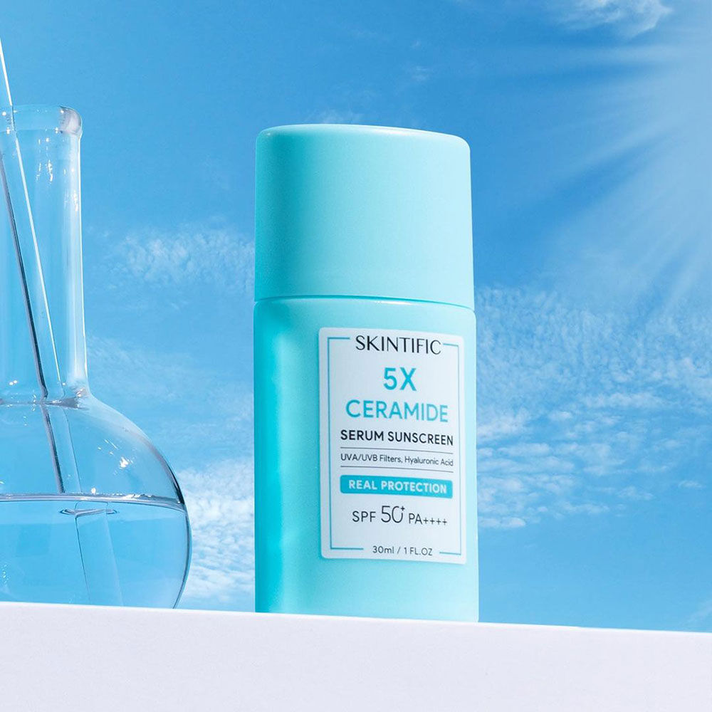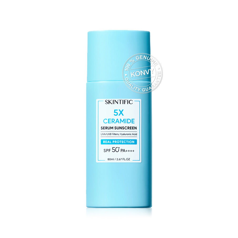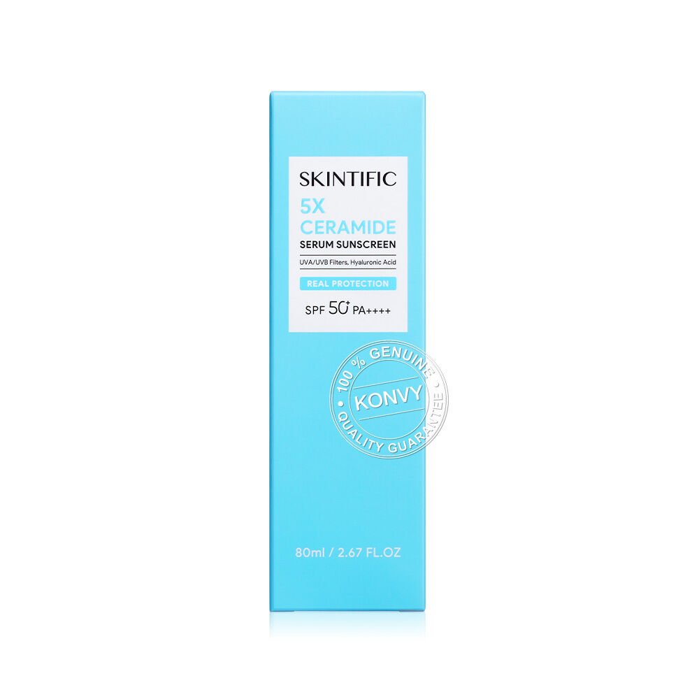 SKINTIFIC 5X Ceramide Serum Sunscreen SPF50+ PA++++ 80ml เซรั่มกันแดดที่มีเซราไมด์ เพื่อฟื้นฟูเกราะป้องกันผิว ประกอบด้วย UV Filter ชนิดใหม่ล่าสุด ซึ่งสามารถปกป้องผิวจากรังสี UVA & UVB ด้วยค่า SPF50+ PA++++ เนื้อบางเบา ซึมซาบเร็ว ไม่เหนียวเหนอะหนะ พร้อมมอบความชุ่มชื้น เพิ่ม Hyaluronic Acid ที่สามารถฟื้นฟูและกักเก็บความชุ่มชื้นไว้ในผิว