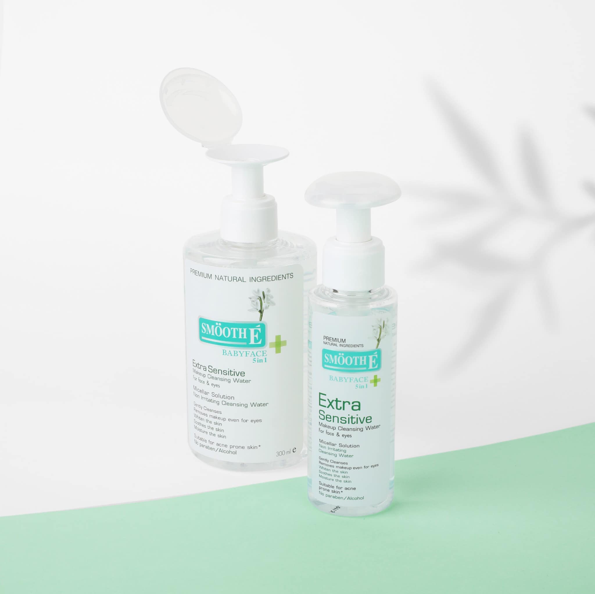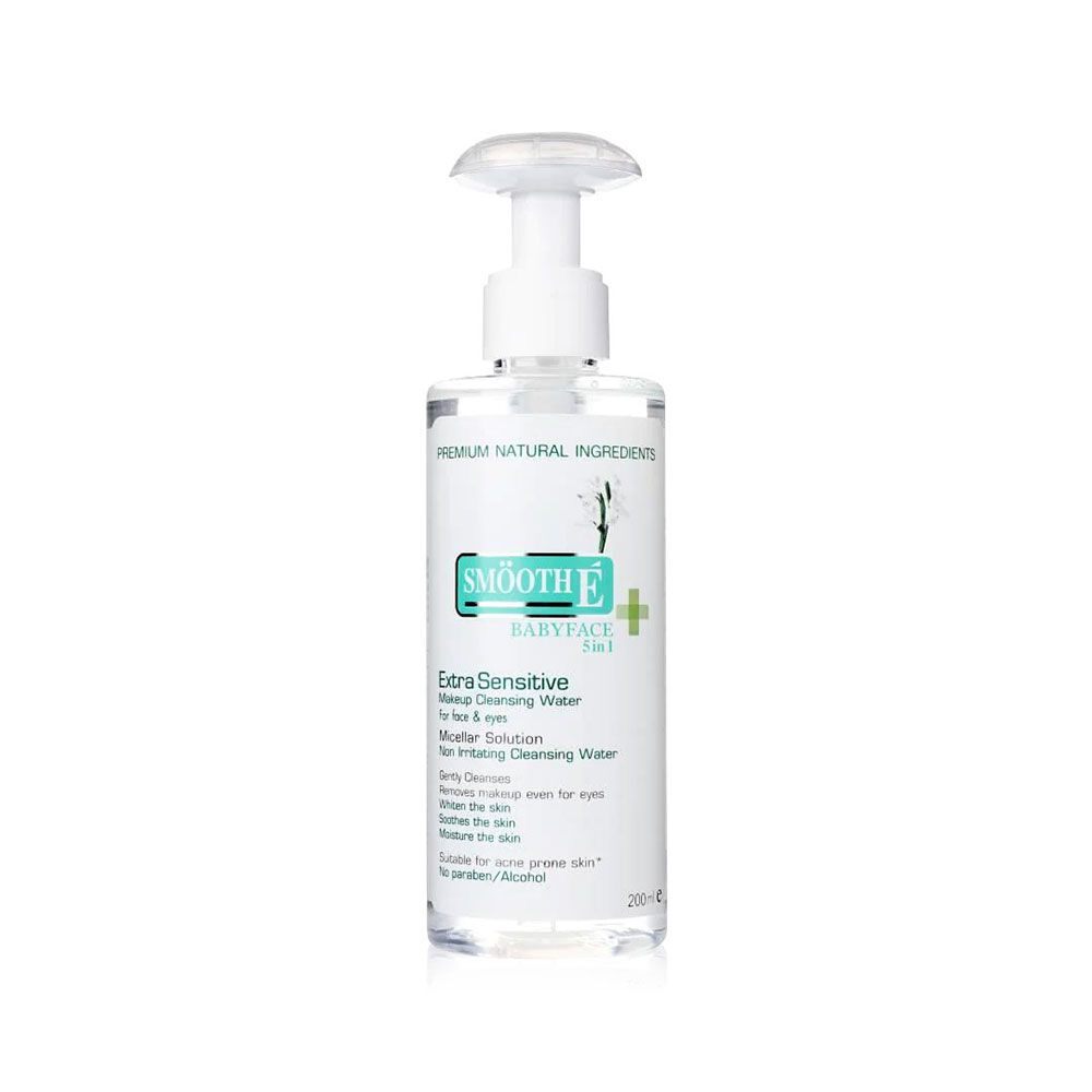 Smooth E Babyface Extra Sensitive Makeup Cleansing Water for Face & Eyes 200ml เวชสำอางสำหรับเช็ดทำความสะอาดผิวหน้าและเครื่องสำอางสูตรน้ำ ทำความสะอาดล้ำลึกพร้อมให้ความชุ่มชื่นกับผิวในขั้นตอนเดียว ด้วยองค์ประกอบพื้นฐานจากธรรมชาติ ผสานเข้ากับเทคโนโลยี Micellar Solution จากประเทศฝรั่งเศส ทำความสะอาดผิวอย่างล้ำลึกโดยไม่ทิ้งสิ่งตกค้างจนก่อให้เกิดสิว ลดการอุดตัน ริ้วรอย และความหมองคล้ำ พร้อมช่วยคงสมดุลผิวอย่างเป็นธรรมชาติ