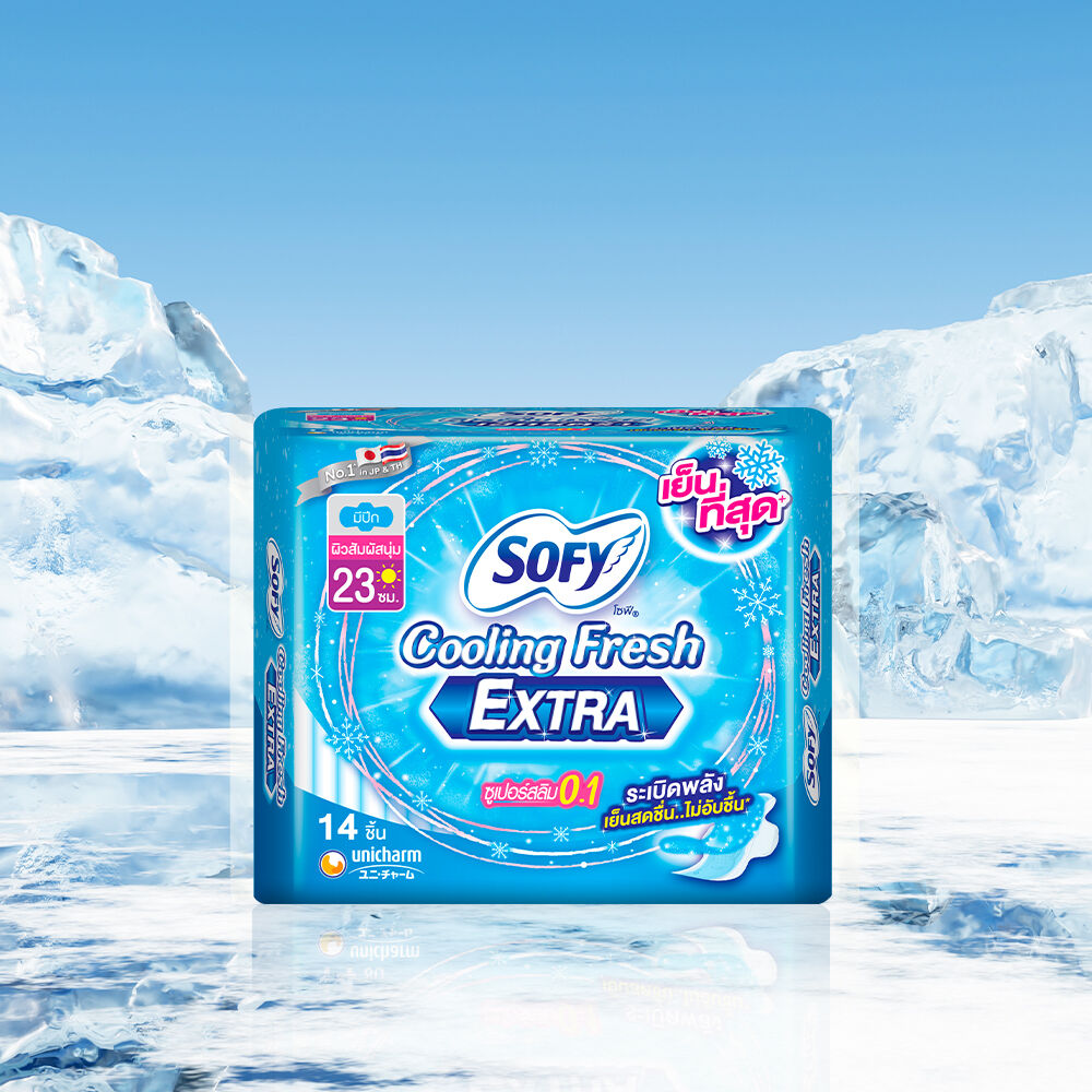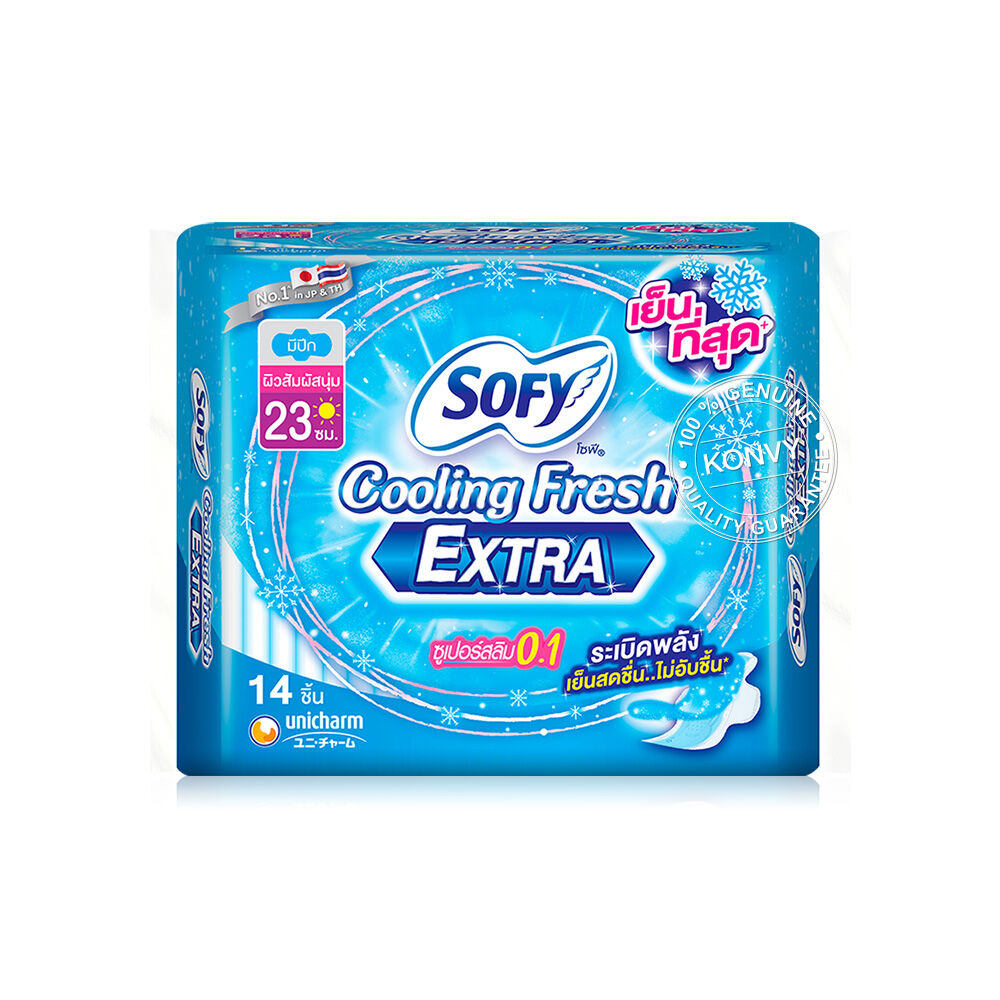 Sofy ผ้าอนามัย Cooling Fresh Extra Day SuperSlim0.1 Wing [23cm x 14pcs] ระเบิดพลังความเย็นสุดขั้วกับผ้าอนามัยสำหรับกลางวัน มีปีก ยาว 23ซม. ด้วยนวัตกรรมแผ่น Extra Cool รู้สึกเย็นสุดขั้วกว่าที่เคย ลดความอับชื้น พร้อมล็อคกลิ่น ไม่ว่าเมื่อไหร่ก็รู้สึกเย็นสดชื่นขั้นสุดได้อีกครั้ง