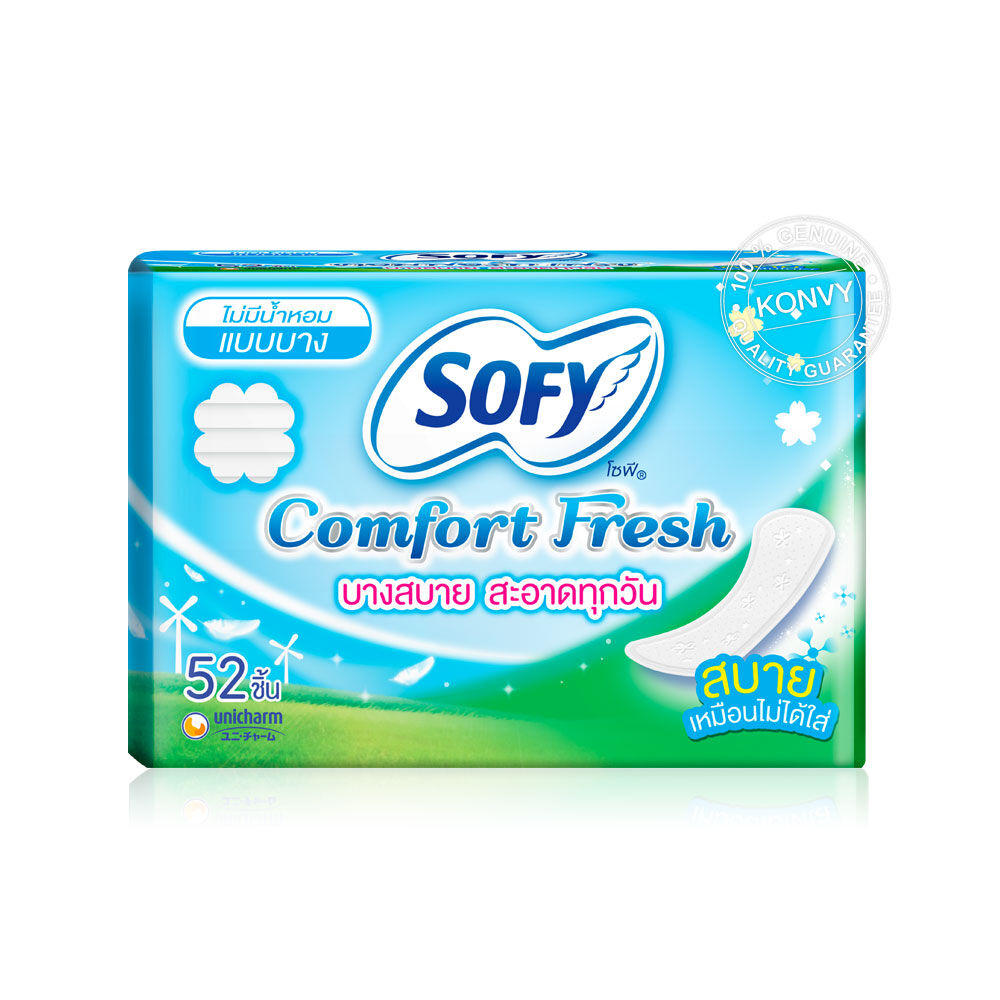 Sofy แผ่นอนามัย Slim Comfort Fresh Unscented 52pcs แผ่นอนามัยแบบบาง ไม่มีน้ำหอม บางพอดีสำหรับทุกวัน ให้ความรู้สึกสบายเหมือนไม่ได้สวมใส่ ด้วยพื้นที่ซึมซับที่กว้าง ให้คุณมั่นใจ บางสบาย สะอาดทุกวัน