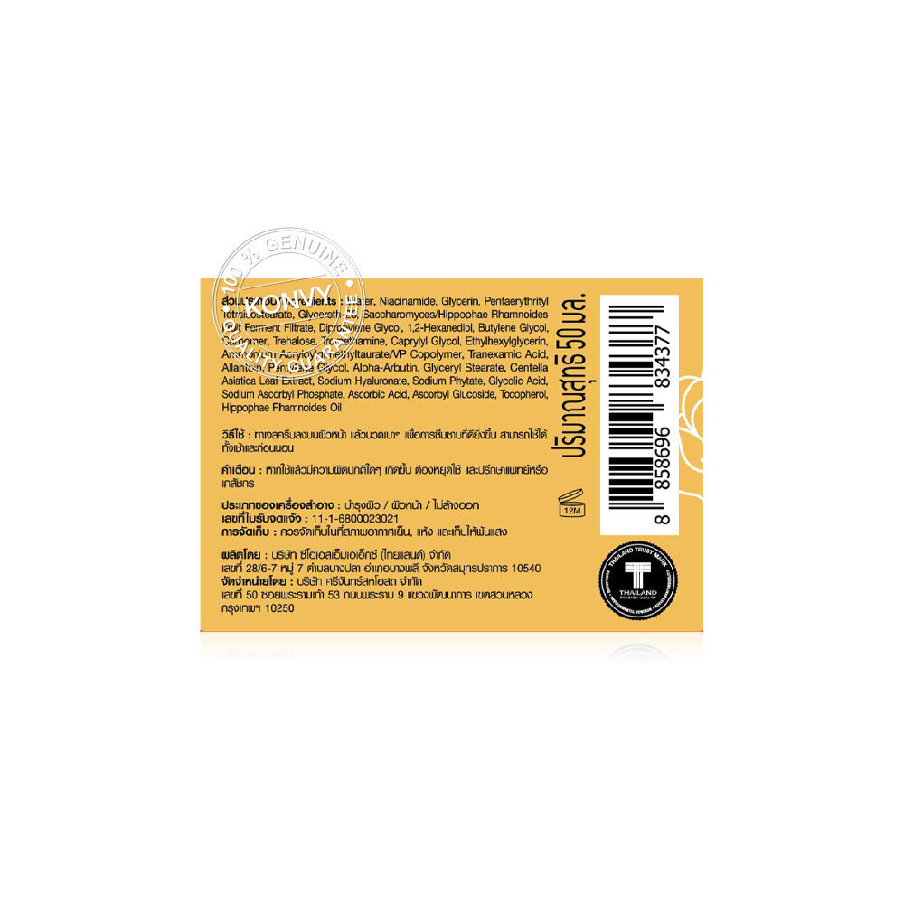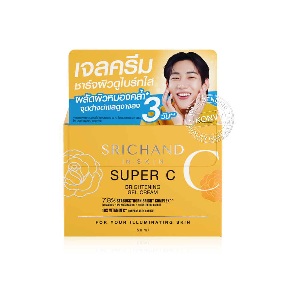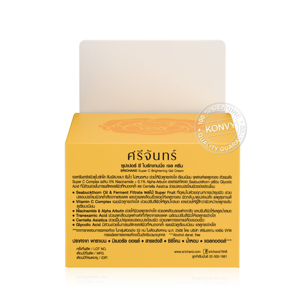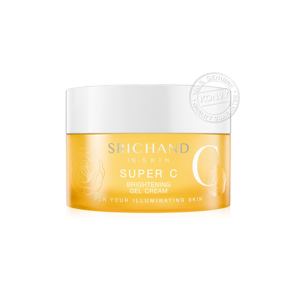 Srichand Super C Brightening Gel Cream 50ml เจลครีม สัมผัสบางเบา ซึมไว ไม่เหนอะหนะ ช่วยให้ผิวดูกระจ่างใส เรียบเนียน จุดด่างดำแลดูจางลง ด้วยพลัง Super C Complex ผสาน 5% Niacinamide + 0.1% Alpha-Arbutin และสารสกัดจาก Sea Buckthorn พร้อม Glycolic Acid ช่วยผลัดเซลล์ผิวหมองคล้ำ และ Centella Asiatica ปลอบประโลมผิวอย่างอ่อนโยน