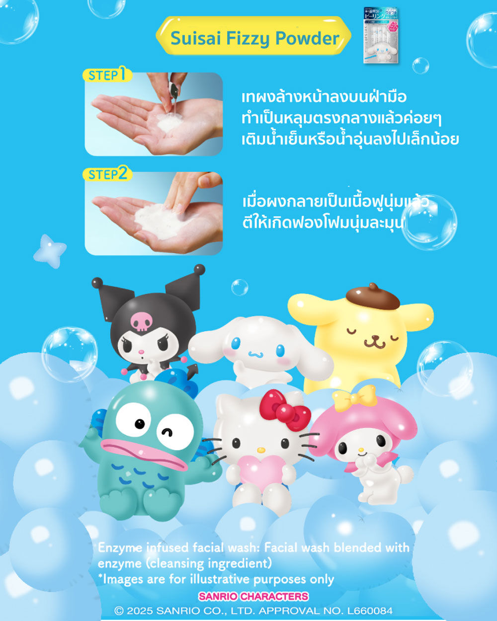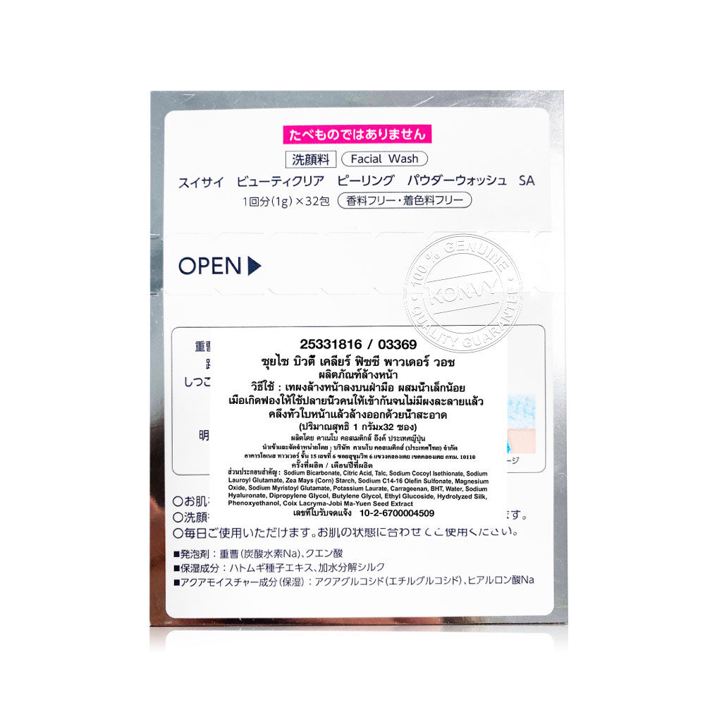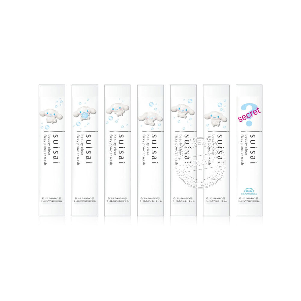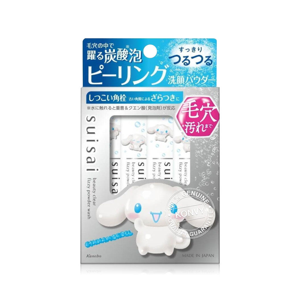 SUISAI Beauty Clear Fizzy Powder Wash SA Cinnamoroll Sanrio Collection 32 Capsules ผงล้างหน้าผลัดเซลล์ผิว ลาย Cinnamoroll เพื่อผิวกระจ่างใส เรียบเนียนขึ้น ลดปัญหาการเกิดสิว และรอยหลุมสิว ผิวรู้สึกสะอาด นุ่มไม่แห้งตึง ฟองโฟมคาร์บอเนต ทำความสะอาดล้ำลึกถึงรูขุมขน ช่วยขจัดการอุดตันของเคราตินและความหยาบกร้าน เบกกิ้งโซดา และกรดซิตริก จะเกิดฟอง และทำปฏิกิริยาเมื่อสัมผัสน้ำ ช่วยลดการเกิดหลุมสิวและสิว ให้ผิวกระจ่างใสและปราศจากความหมองคล้ำ ผิวชั้น stratum corneum เรียบเนียน และนุ่มลื่น