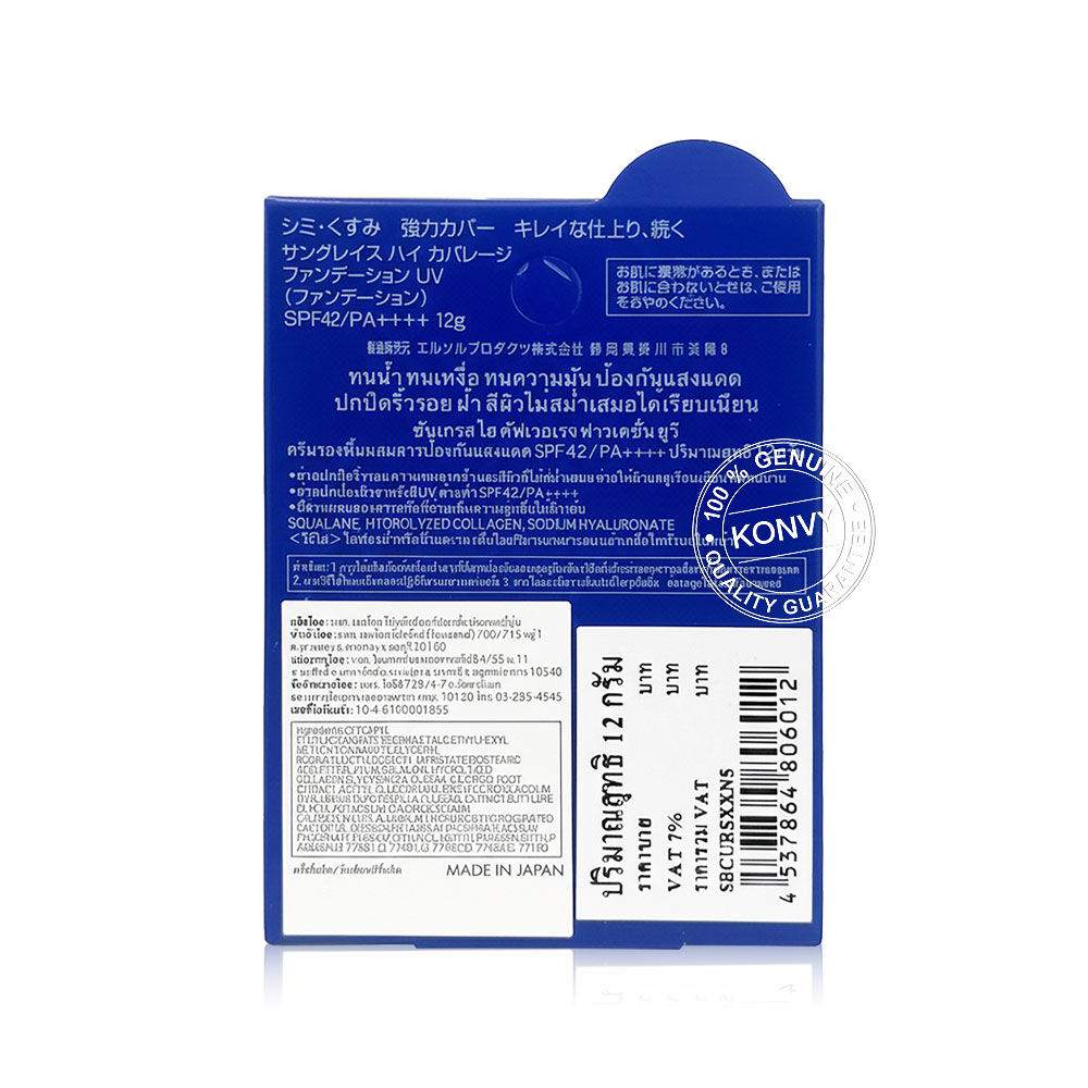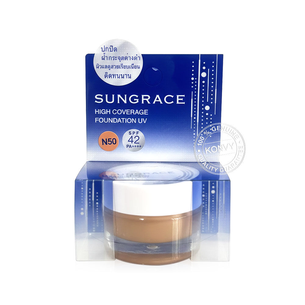 SUNGRACE High Coverage Foundation UV 12g #N50 รองพื้นเนื้อครีม เกลี่ยง่าย กันน้ำ กันเหงื่อ ติดทนนาน ให้การปกปิดสูง ช่วยปกปิดรอยสิว จุดด่างดำ และความหมองคล้ำใต้ตา ได้อย่างเรียบเนียน และปกป้องผิวจากรังสี UVA/UVB พร้อมผสานคอลลาเจน, สารสกัดจาก Ergothioneine และสารสกัดจากต้นโพเทนทิลลา ฟูลเกน ช่วยเติมความชุ่มชื้นให้ผิว เผยผิวเนียนสวยเป็นธรรมชาติ ดูอ่อนเยาว์ สุขภาพดี