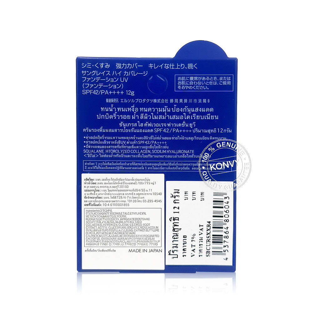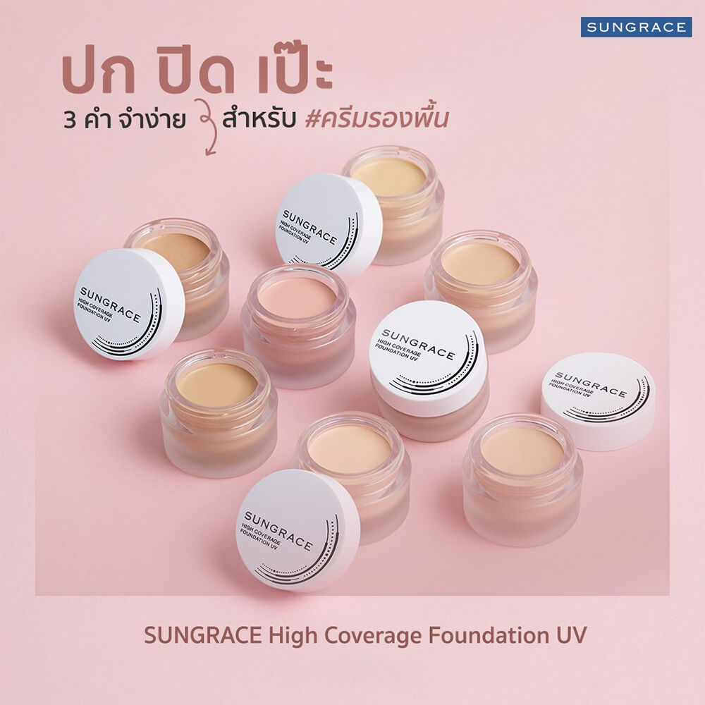 SUNGRACE High Coverage Foundation UV 12g #R40 รองพื้นเนื้อครีม เกลี่ยง่าย กันน้ำ กันเหงื่อ ติดทนนาน ให้การปกปิดสูง ช่วยปกปิดรอยสิว จุดด่างดำ และความหมองคล้ำใต้ตา ได้อย่างเรียบเนียน และปกป้องผิวจากรังสี UVA/UVB พร้อมผสานคอลลาเจน, สารสกัดจาก Ergothioneine และสารสกัดจากต้นโพเทนทิลลา ฟูลเกน ช่วยเติมความชุ่มชื้นให้ผิว เผยผิวเนียนสวยเป็นธรรมชาติ ดูอ่อนเยาว์ สุขภาพดี