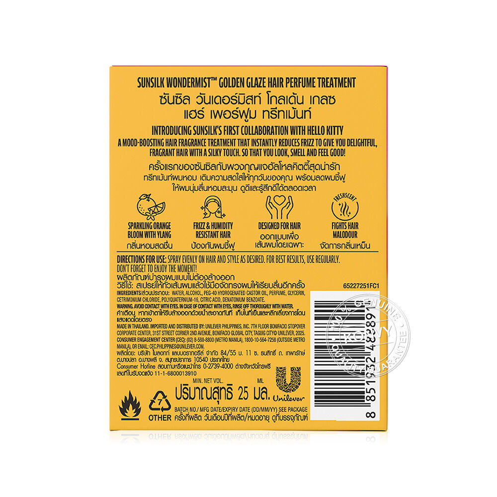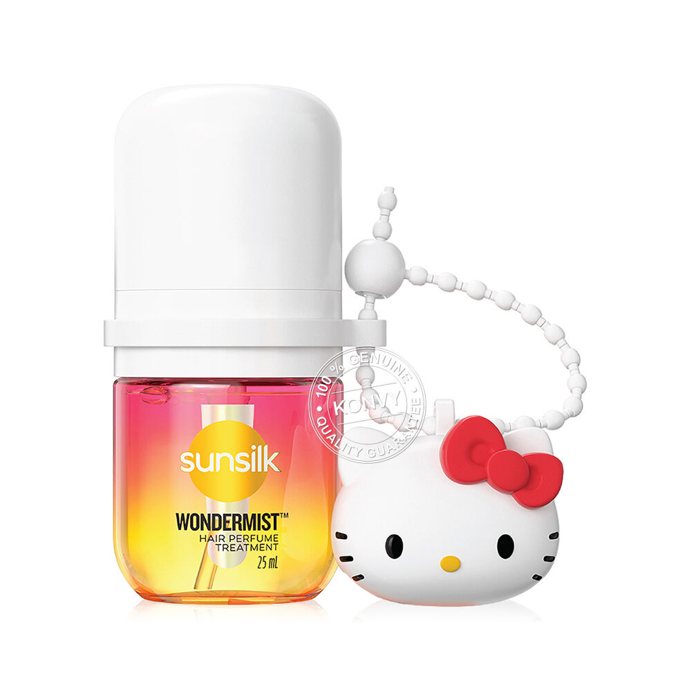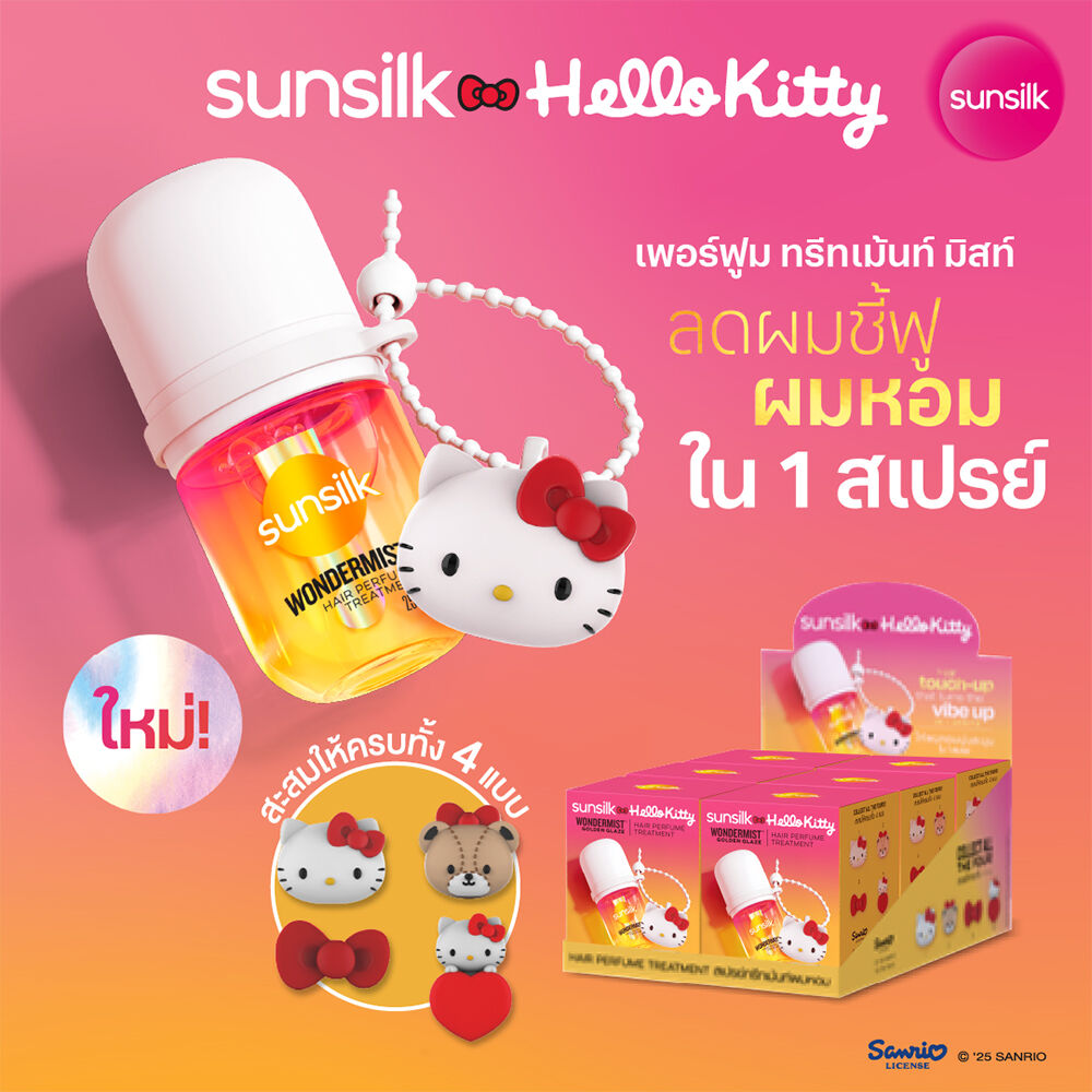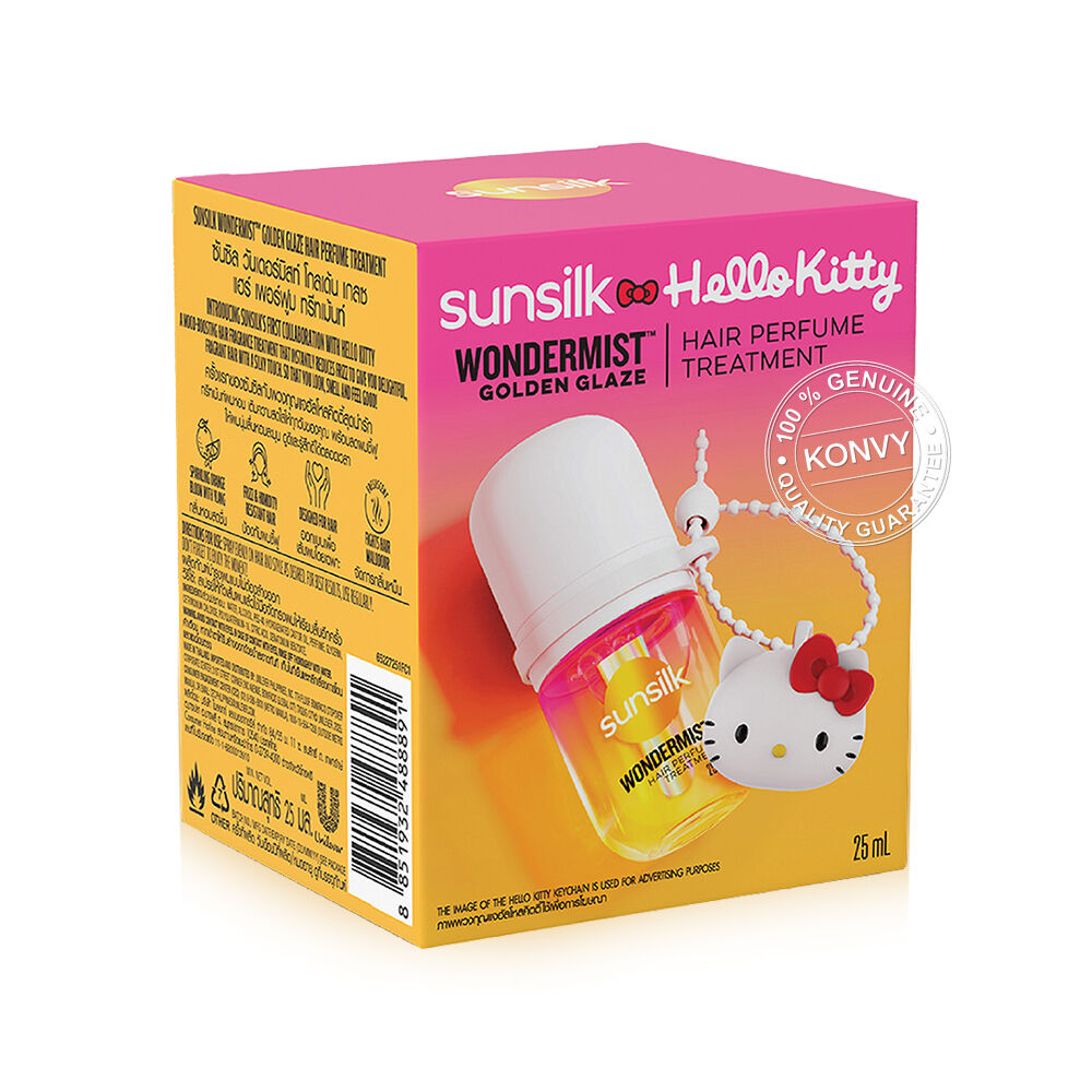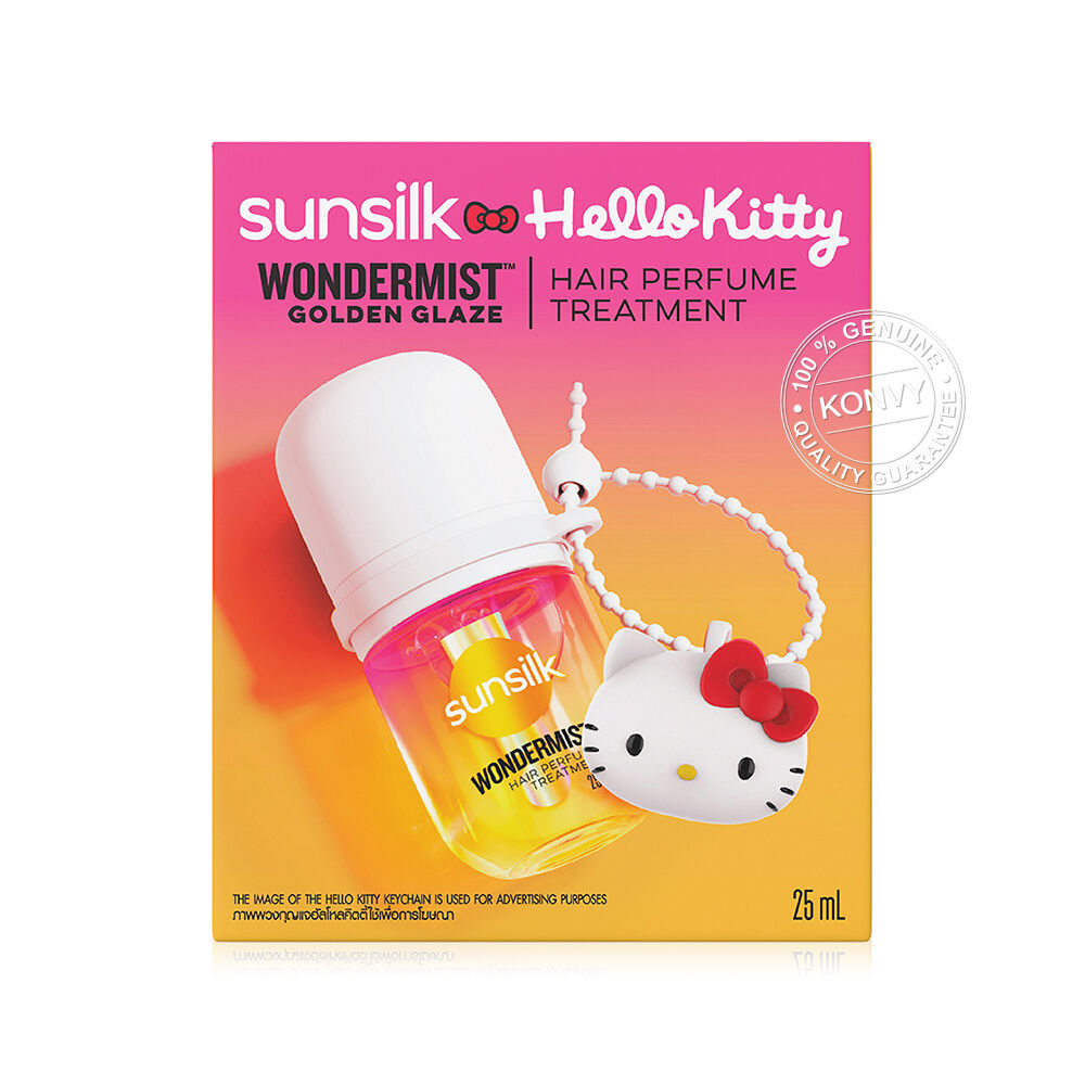 Sunsilk x Hello Kitty Hair Perfume Treatment Wondermist Golden Glaze 25ml สเปรย์น้ำหอมสำหรับฉีดผม กลิ่น Golden Glaze เติมความสดใสให้ทุกวันของคุณ พร้อมลดผมชี้ฟูให้ผมนุ่มลื่น หอมละมุน ดูดีและรู้สึกดีได้ตลอดเวลา มาพร้อมกับพวงกุญแจฮัลโหลคิตตี้สุดน่ารัก แบบคละลาย 4 แบบให้สะสม