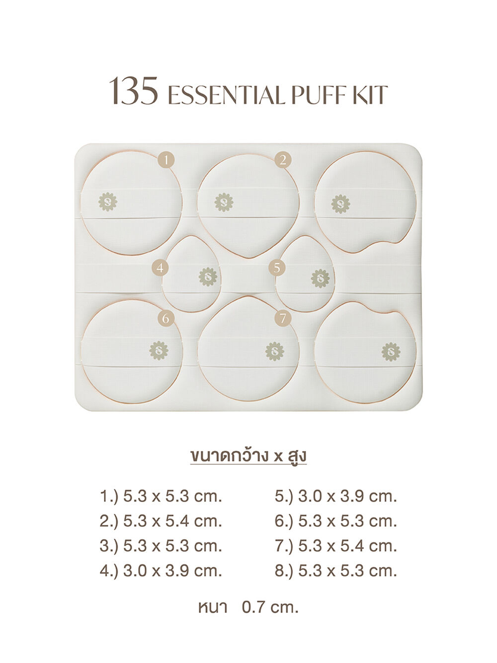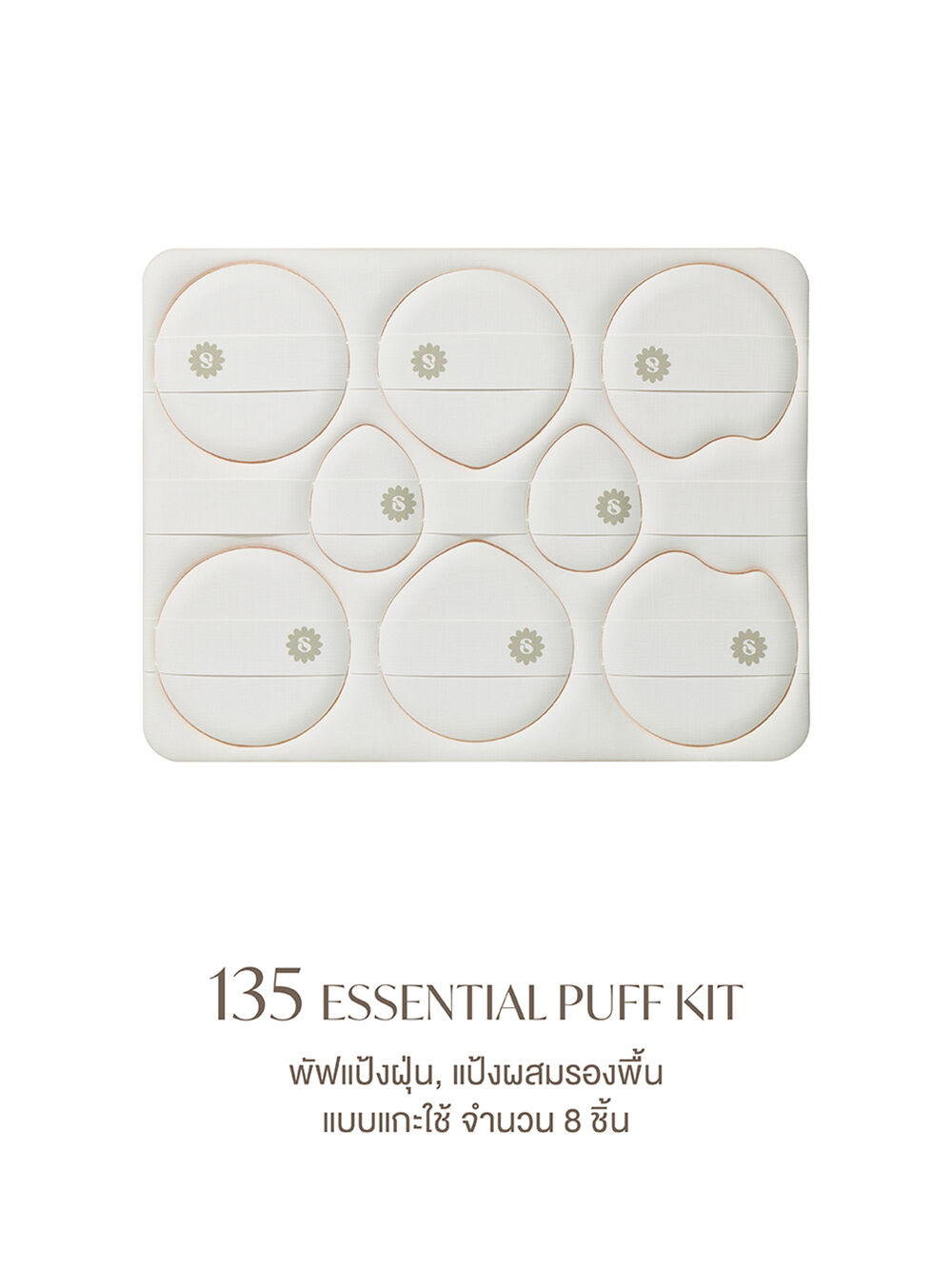 SUPERMOM Essential Puff Kit 8pcs #135 เซทพัฟ 8 ชิ้น แบบแกะใช้ สำหรับแป้งฝุ่น แป้งผสมรองพื้น แป้งอัดแข็ง ออกแบบให้ใช้งานง่าย หลากหลายทรง และหลายขนาด ผลิตจาก Rubycell เกรดพรีเมียม เนื้อสัมผัสนุ่ม แน่น คืนตัวดี ช่วยเกลี่ยเนื้อผลิตภัณฑ์ให้กระจายตัวสม่ำเสมอ แกะใช้-สะดวก-สะอาด