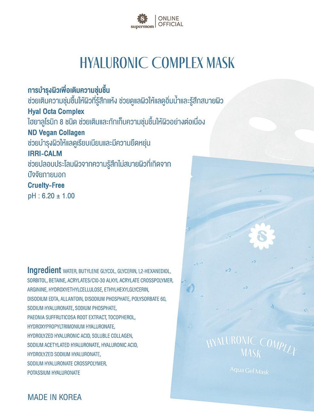SUPERMOM Hyaluronic Complex Mask 30ml แผ่นมาสก์หน้าเจลลี่ สูตรเติมความชุ่มชื้น เนื้อเซรั่มแนบผิว อุดมด้วยส่วนผสมจาก Hyaluronic 8 ชนิด ช่วยเติมและกักเก็บความชุ่มชื้นให้ผิว ผสานคอลลาเจนจากพืช และ IRRI-CALM ช่วยฟื้นบำรุงผิวให้เรียบเนียน พร้อมปลอบประโลมผิวจากการระคายเคือง มอบผิวเนียนนุ่ม อิ่มน้ำ