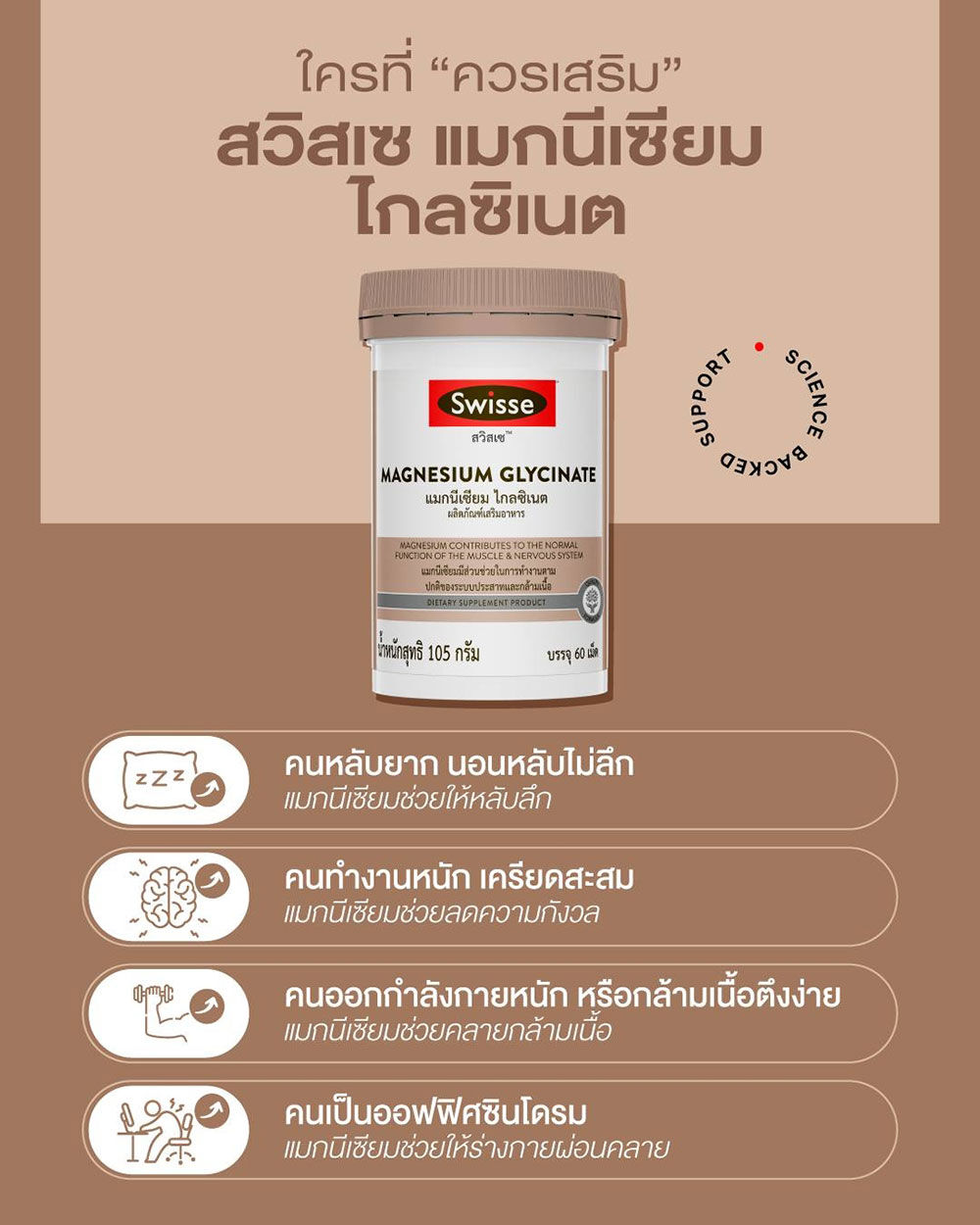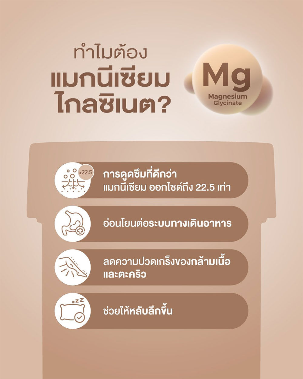 • แมกนีเซียม ไกลซิเนต 1,064 มก. (แมกนีเซียม 150 มก.)