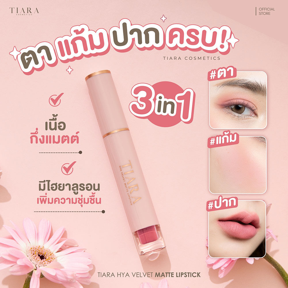 TIARA BEAUTY Hya Velvet Matte Lipstick 3g #11 Today is A Great Day เรียวปากชุ่มชื้นไม่ตกร่องด้วยลิปแมทผสมไฮยาลูรอน ช่วยมอบความชุ่มชื้นพร้อมบำรุงไปในตัว อ่อนโยนต่อริมฝีปาก เม็ดสีแน่นคมชัดในปาดเดียว ติดทนนาน หมดกังวลเรื่องการเติมระหว่างวัน มาพร้อมหัวแปรง RESERVOIR APPLICATOR ลักษณะเหมือนอ่างเก็บน้ำที่จะมีจุดแบ่งรูเล็กๆ ตรงกลาง เป็นรูปทรงสามเหลี่ยมคล้ายหยดน้ำ มีความเฉียงเล็กน้อยเพื่อรับรูปปากได้ดี ช่วยให้เกลี่ยเนื้อลิปเกลี่ยง่าย ปาดได้สม่ำเสมอ เรียบเนียน