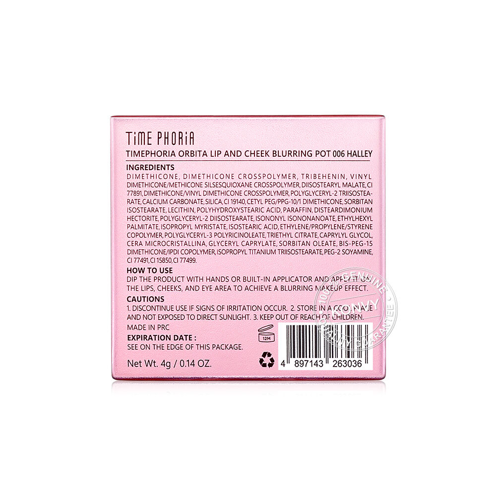 Time Phoria Orbita Lip And Cheek Blurring Pot 4g #006 Halley ลิปแอนด์ชีค ที่มีเทคโนโลยี Smootouch Mud™ และ Patented Color-Processing ให้เนื้อสัมผัสแบบกำมะหยี่ บางเบา เม็ดสีชัด เกลี่ยง่าย ติดทนนาน อีกทั้งยังมีนวัตกรรม Photon Soft-Focus System ช่วยเบลอผิวเนียนสวย มาพร้อมแอปพลิเคเตอร์หัวซิลิโคนในตัว ใช้งานง่าย มอบฟินิชแมทฟุ้งละมุน สวยจบในขั้นตอนเดียว