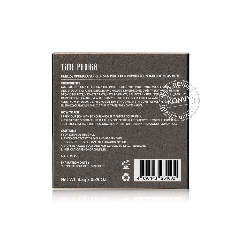 Time Phoria Timeless Optima Cover-Blur Skin Perfection Powder Foundation 8.5g #03N Cashmere แป้งผสมรองพื้น เนื้อสัมผัสแบบ Hyperfine Texture บางเบา สบายผิว เกลี่ยง่าย ไม่เป็นคราบ ไม่ตกร่อง ควบคุมความมันยาวนาน ด้วย Flux-Matte™ Technology พร้อมมี Micro Skin-Melting Powder ผสานเทคโนโลยี Airflow Vortex Micronization ช่วยเบลอผิวให้เรียบเนียนดุจซอฟต์โฟกัส มอบฟินิชผิวแมทเนียนสวย มั่นใจไม่มีดรอป