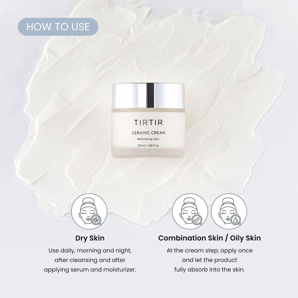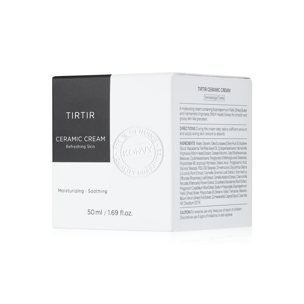 TIRTIR Ceramic Cream 50ml ครีมบำรุงเข้มข้นที่ให้ความชุ่มชื้นล้ำลึก ช่วยให้ผิวเรียบเนียน และล็อกความชุ่มชื้นในทุกขั้นตอนการดูแลผิว อุดมด้วยเซราไมด์ธรรมชาติ เปปไทด์ และสารสกัดจากใบบัวบก มอบความชุ่มชื้นยาวนาน พร้อมเผยผิวเปล่งประกายสุขภาพดี