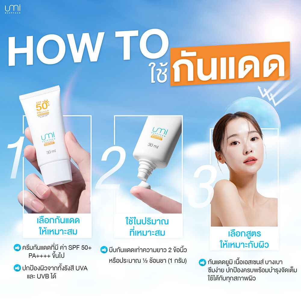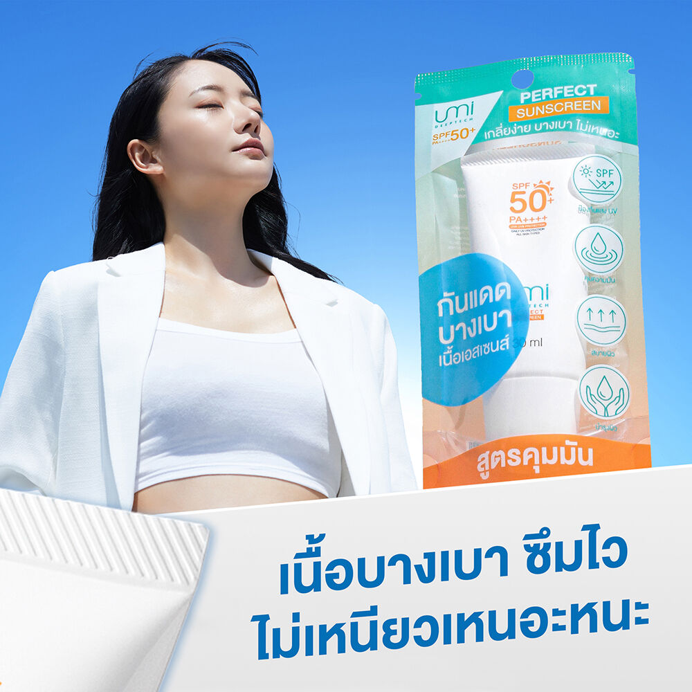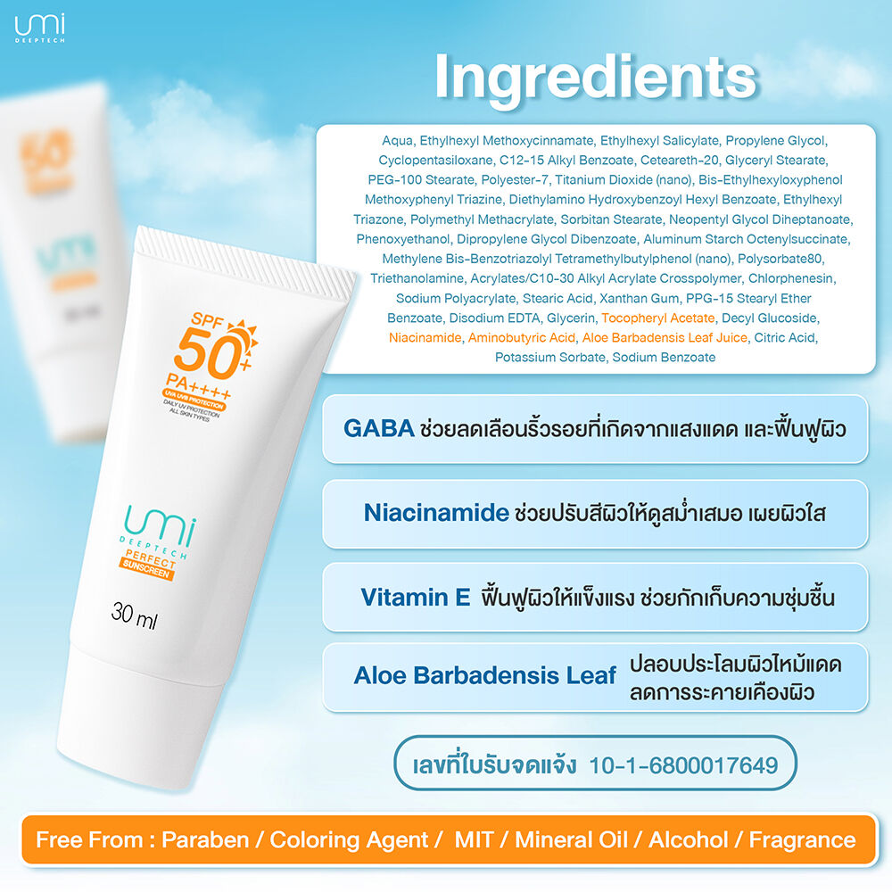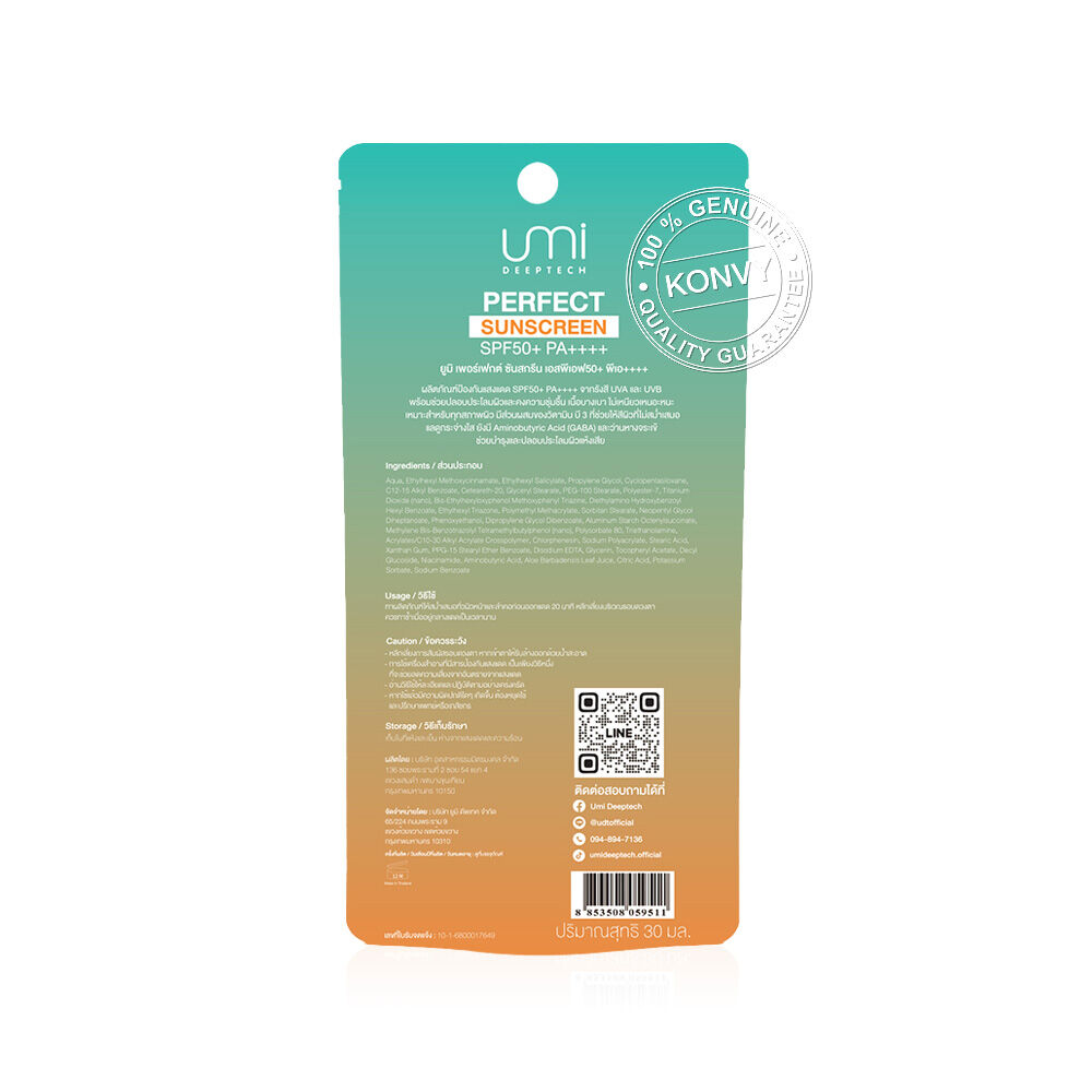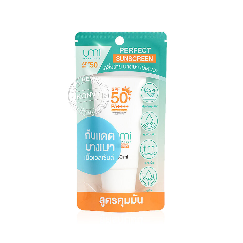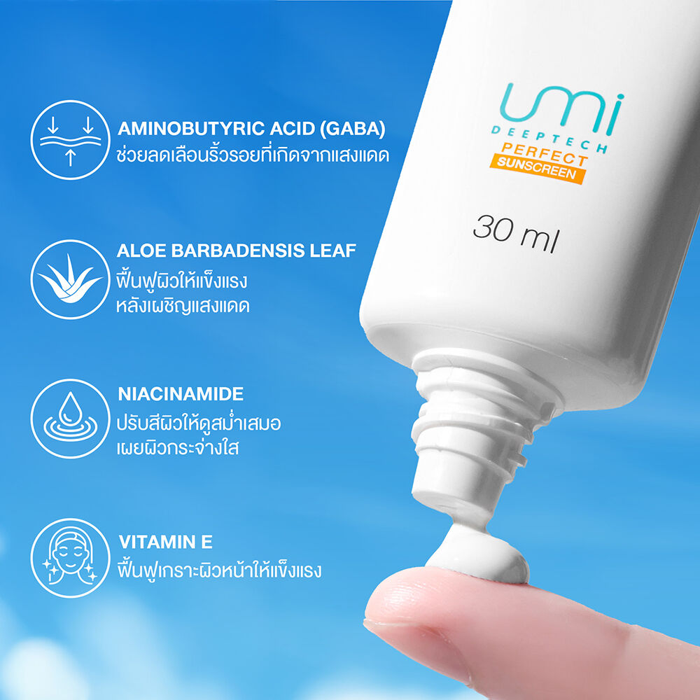 UMI DEEPTECH Perfect Sunscreen SPF50+ PA++++ 30ml กันแดดเนื้อเอสเซนส์ที่ผสานคุณสมบัติบำรุงผิว เข้ากับการปกป้องผิวจากรังสียูวีในแสงแดดไว้ในหลอดเดียวแบบ 2 in 1 อัดแน่นด้วยสารสกัดที่เน้นมอบการบำรุงผิว ปกป้องผิวจากทั้ง UVA และ UVB ด้วย SPF50+ PA++++