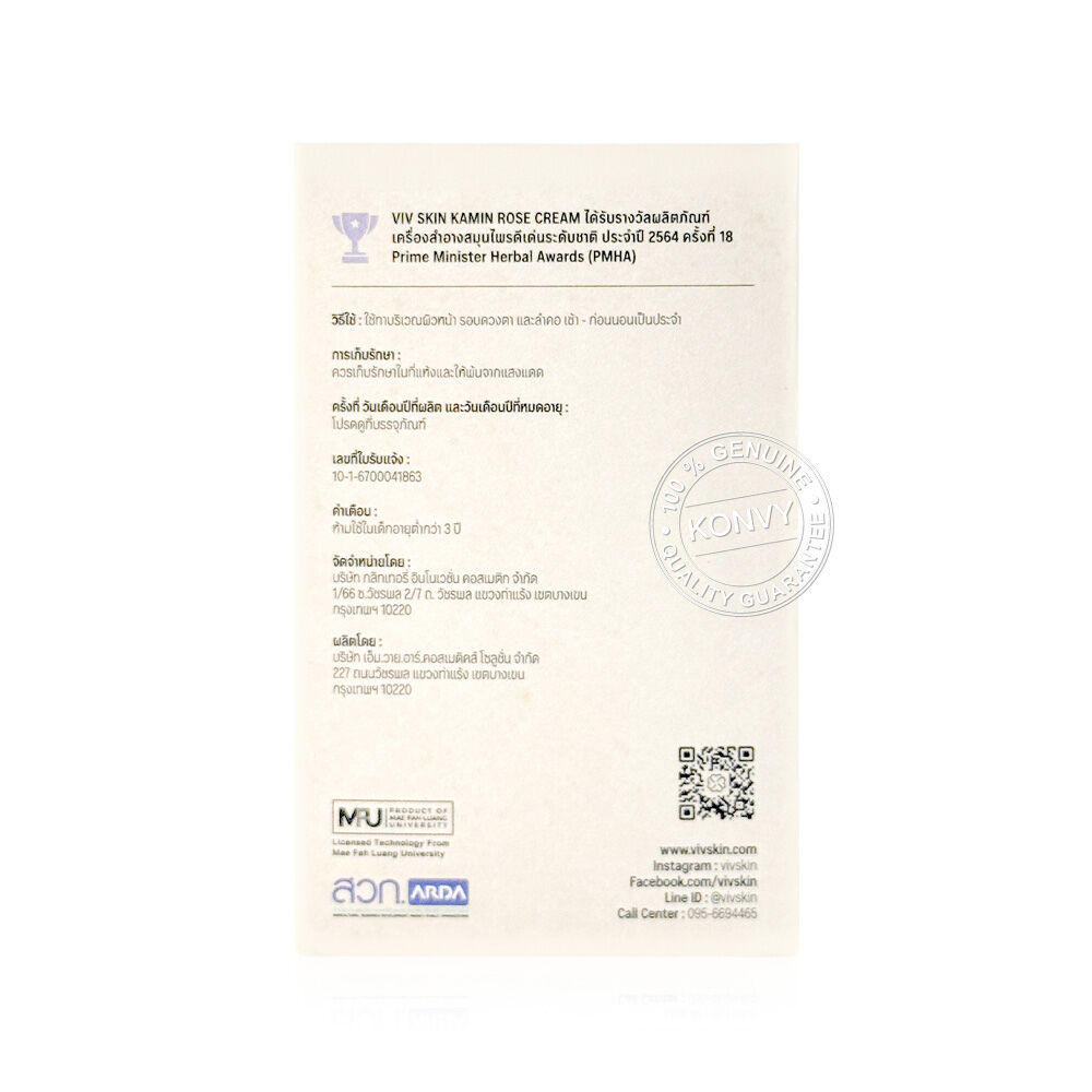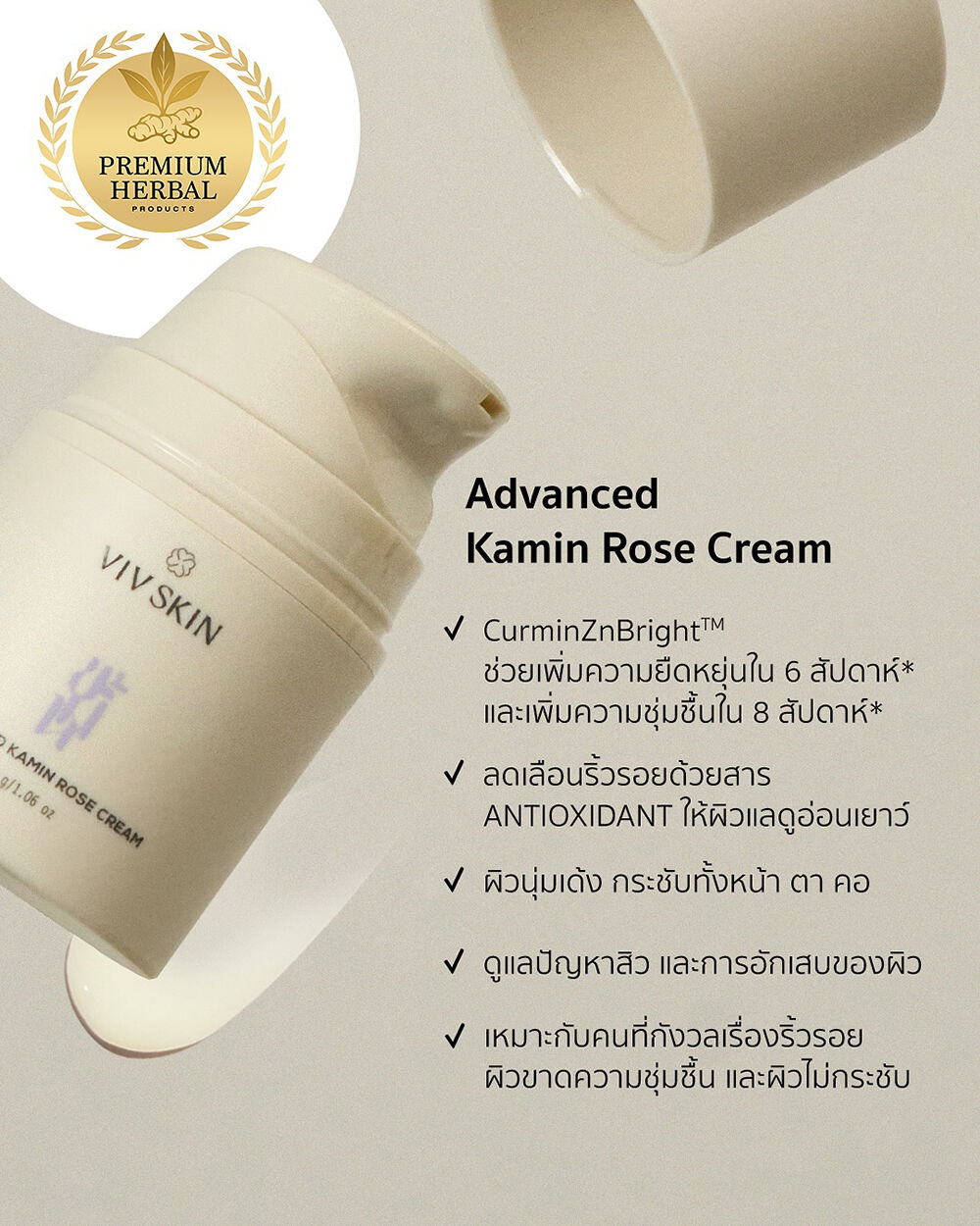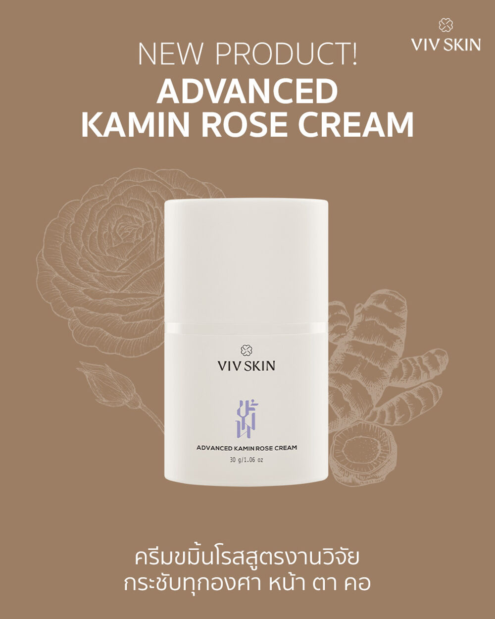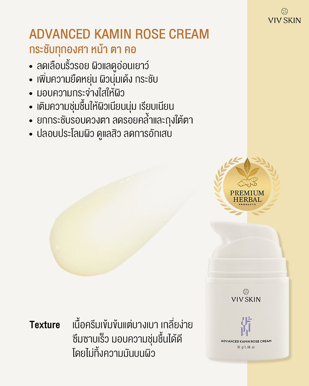 VIV SKIN Advanced Kamin Rose Cream 30g ครีมขมิ้นโรสบำรุงผิว ผสานคุณค่าสมุนไพรจากธรรมชาติ ช่วยลดเลือนริ้วรอย เพิ่มความนุ่มชุ่มชื้น และเสริมความยืดหยุ่น ให้ผิวแลดูเด้งตึงกระชับ เหมาะสำหรับการดูแลผิวบริเวณใบหน้า รอบดวงตา และลำคอ