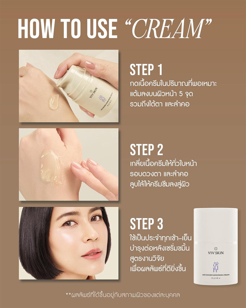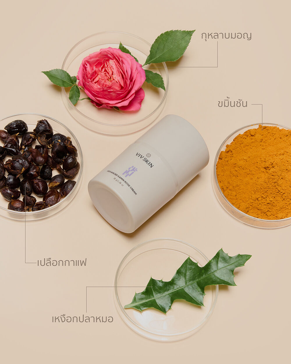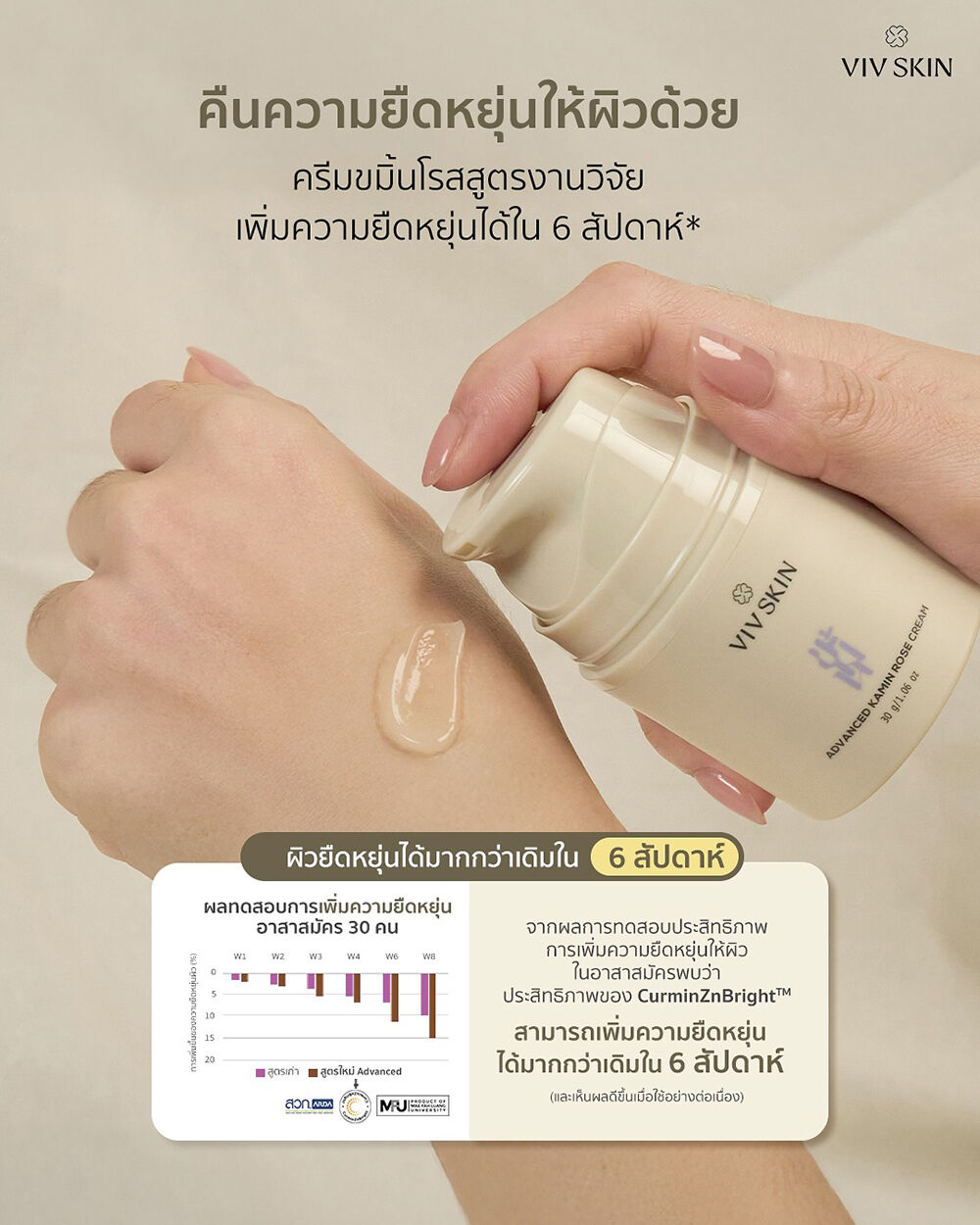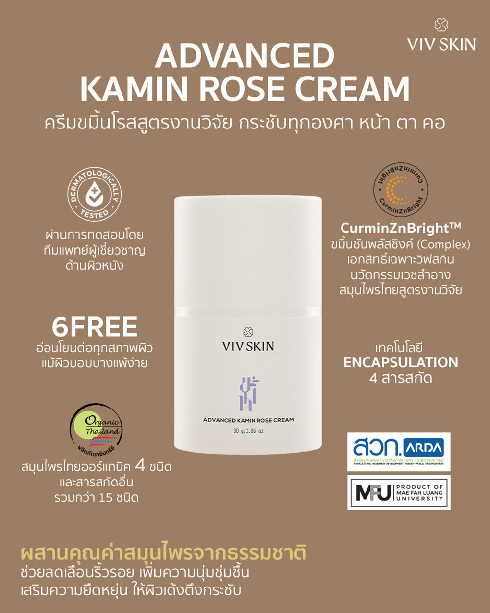 VIV SKIN Advanced Kamin Rose Cream 30g ครีมขมิ้นโรสบำรุงผิว ผสานคุณค่าสมุนไพรจากธรรมชาติ ช่วยลดเลือนริ้วรอย เพิ่มความนุ่มชุ่มชื้น และเสริมความยืดหยุ่น ให้ผิวแลดูเด้งตึงกระชับ เหมาะสำหรับการดูแลผิวบริเวณใบหน้า รอบดวงตา และลำคอ