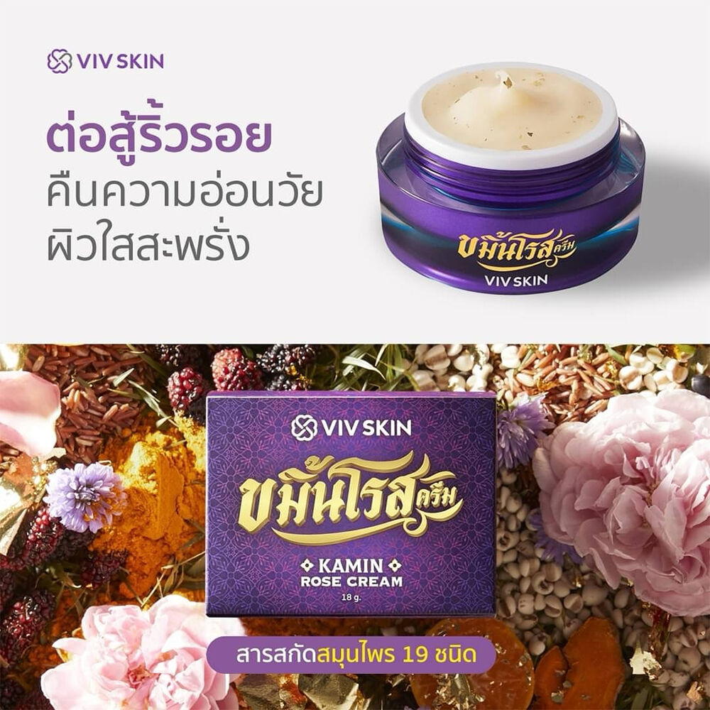 VIV SKIN Kamin Rose Cream 18g ครีมบำรุงผิว ผสานสารสกัดจากธรรมชาติกว่า 19 ชนิด ช่วยลดเลือนริ้วรอย ให้ดูอ่อนเยาว์ นุ่ม ชุ่มชื้น และกระจ่างใสอย่างเป็นธรรมชาติ สามารถใช้ได้ทั้งผิวหน้า รอบดวงตา และลำคอ