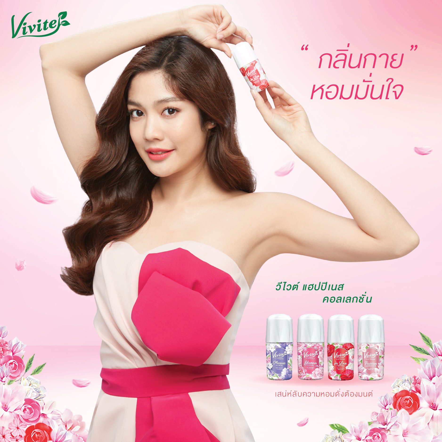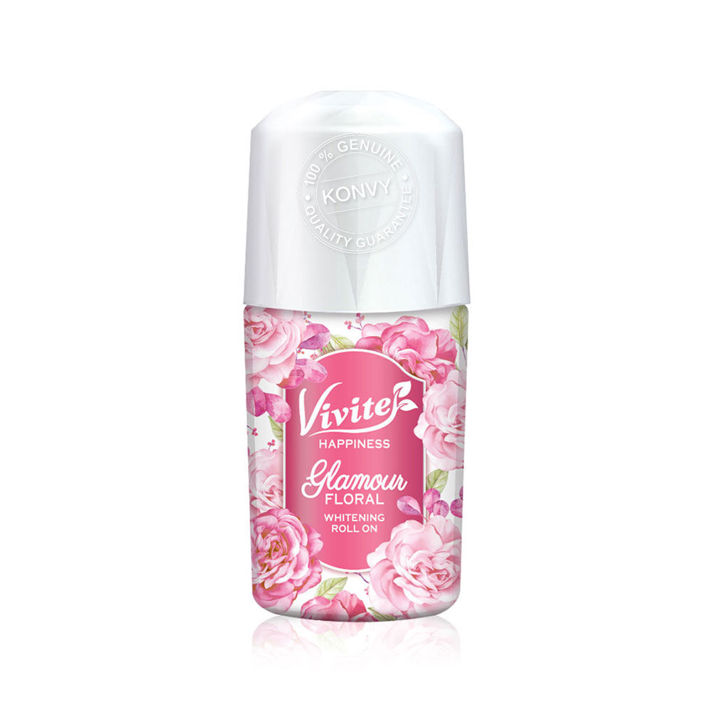 Vivite Happiness Glamour Floral Whitening Roll On [20ml x 4pcs] แก้ปัญหาผิวใต้วงแขนคล้ำเสีย ด้วยโรลออนสูตร 0% แอลกอฮอล์ ผสานสารสกัด Pink Flower Complex ดอกไม้สีชมพู 6 ชนิด พร้อม Perfection Peptide จาก Switzerland และ Vitamin B3 ที่ช่วยผลัดเซลล์ผิวอย่างอ่อนโยน เผยผิวใหม่ที่กระจ่างใส เรียบเนียน มาพร้อมเทคโนโลยี Odour Lock System ที่ช่วยลดกลิ่นกาย ให้มั่นใจได้ตลอดวัน