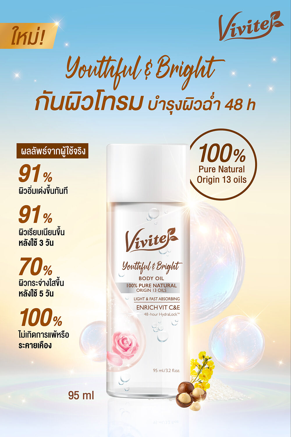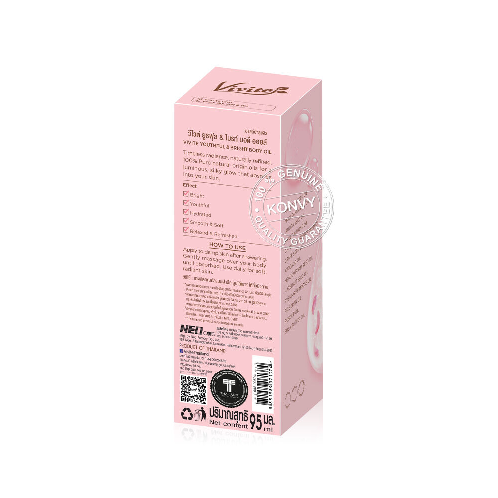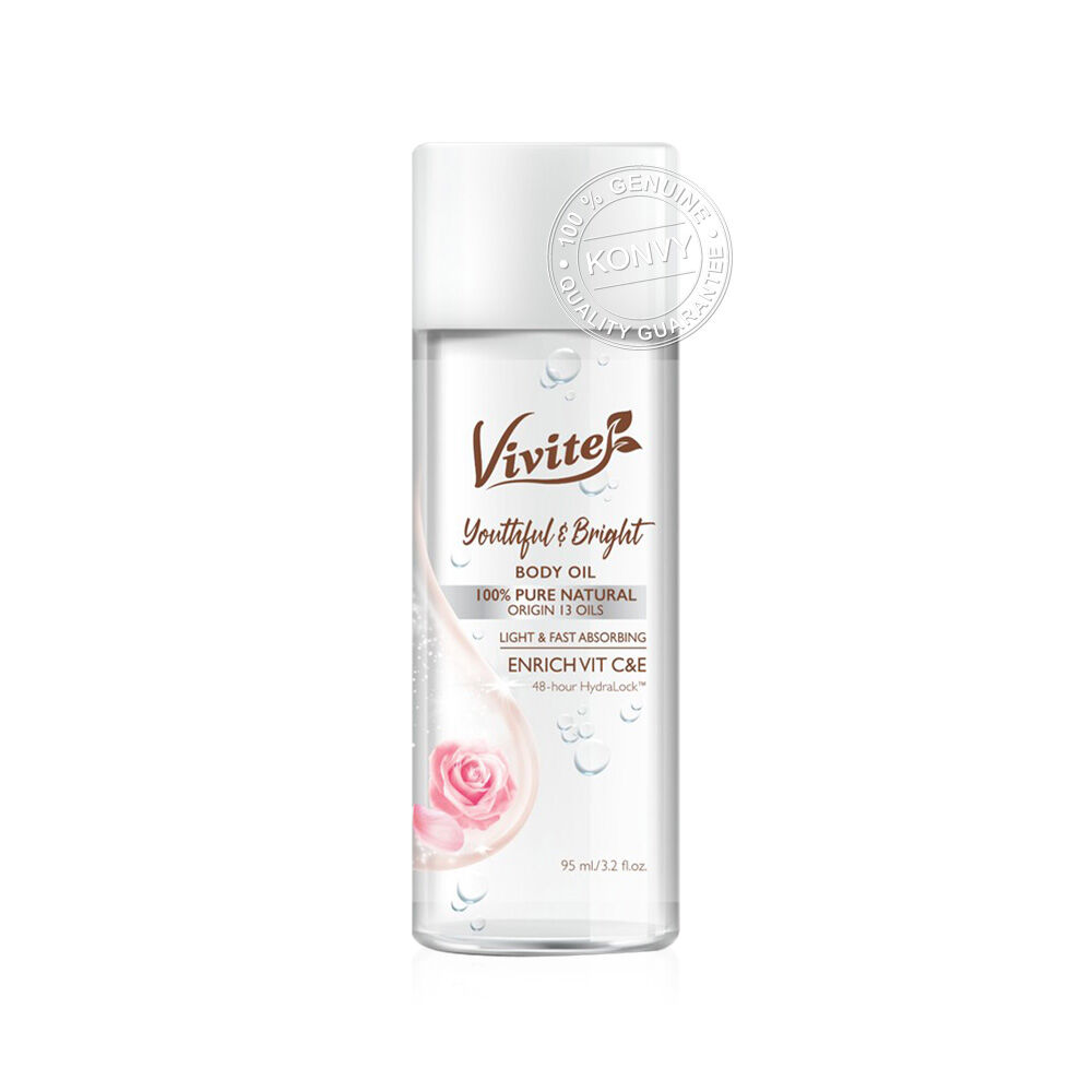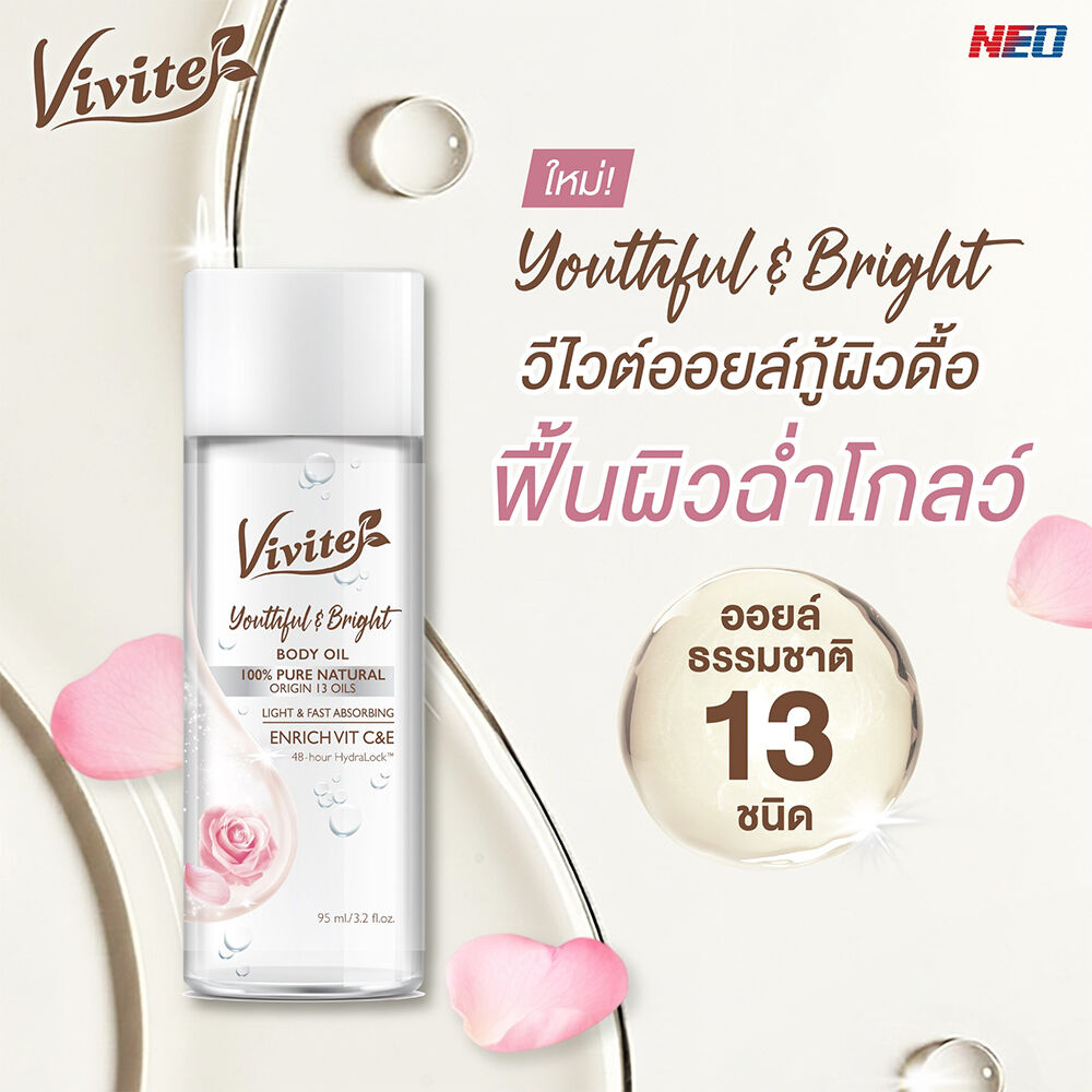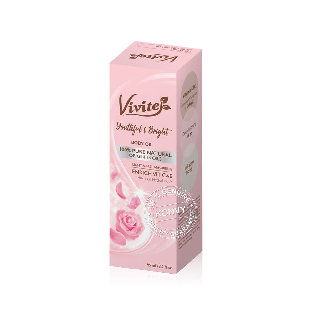 Vivite Youthful & Bright Body Oil 95ml ออยล์บำรุงผิว เนื้อบางเบา ไม่เหนียวเหนอะหนะ ช่วยฟื้นฟูผิวหมองคล้ำและผิวเสียให้กลับมากระจ่างใส ด้วยสารสกัดจากธรรมชาติ เพื่อผิวเนียนนุ่ม ชุ่มชื้น พร้อมกลิ่นหอมอ่อนๆ จาก Essential Oil