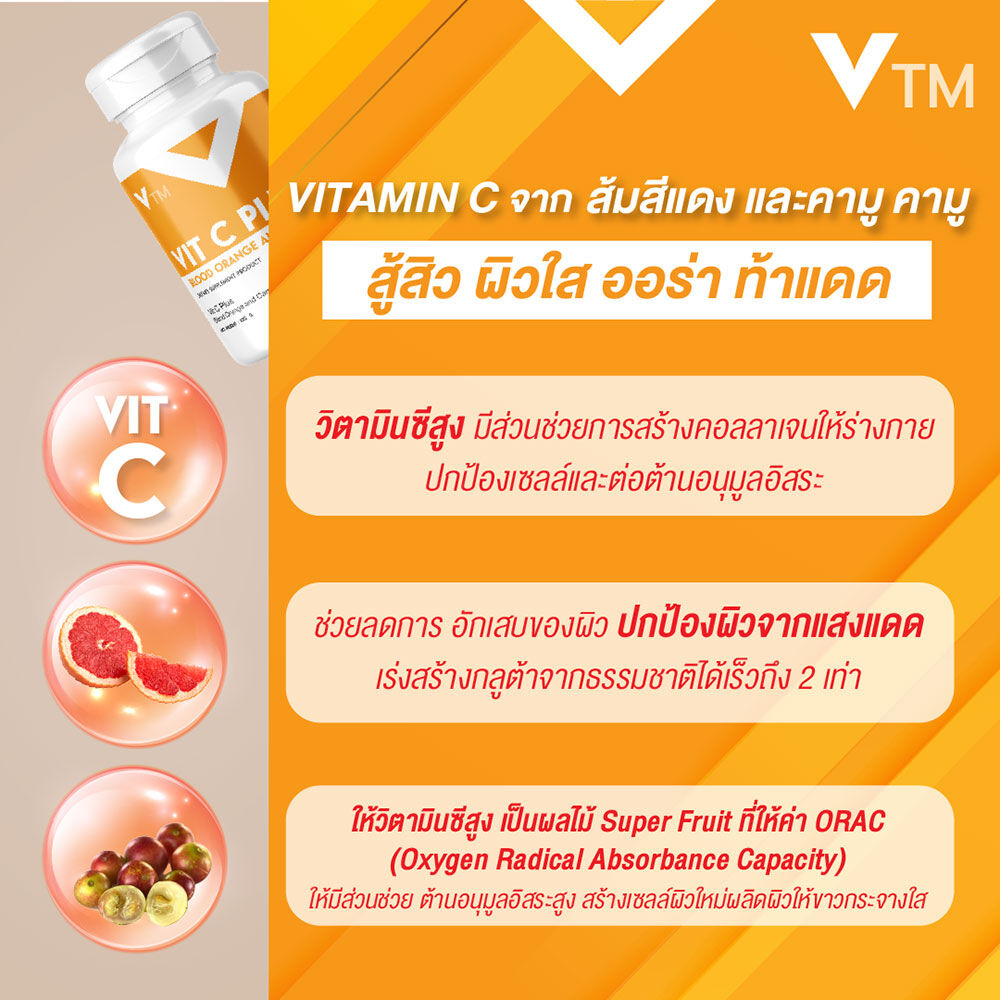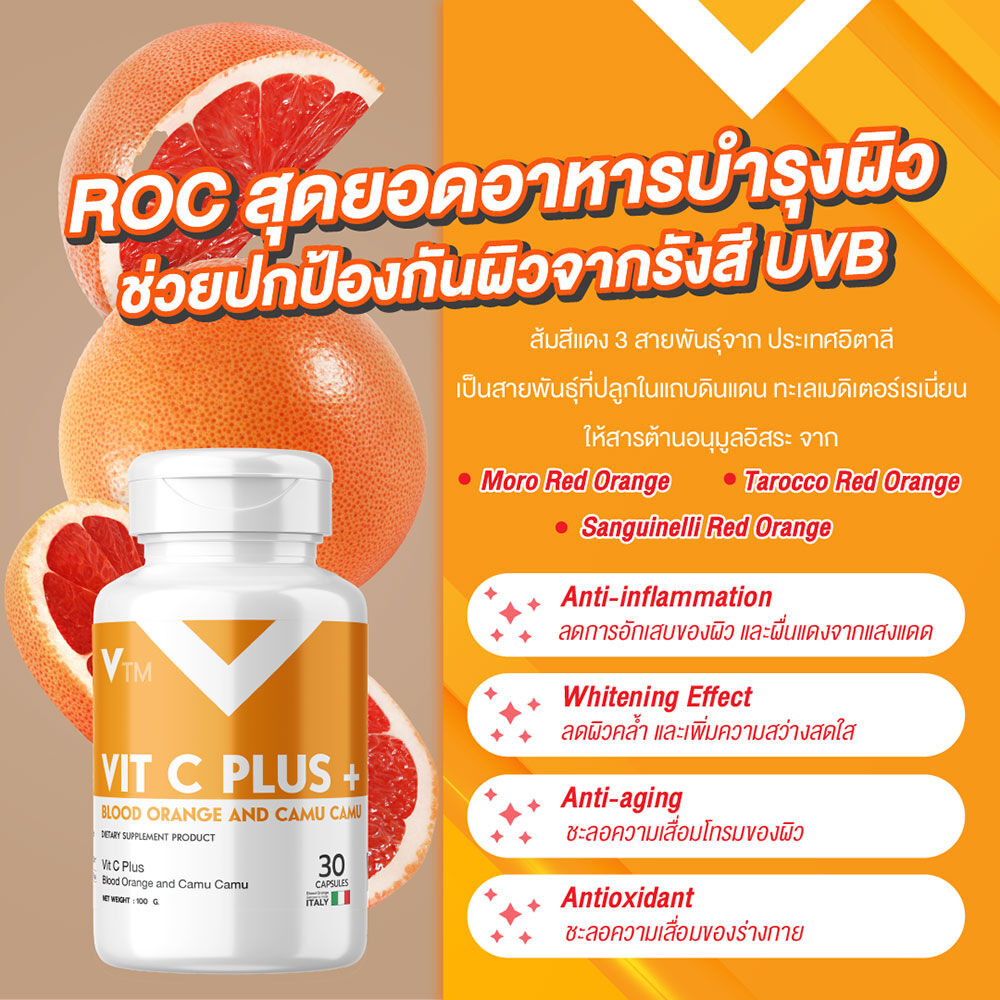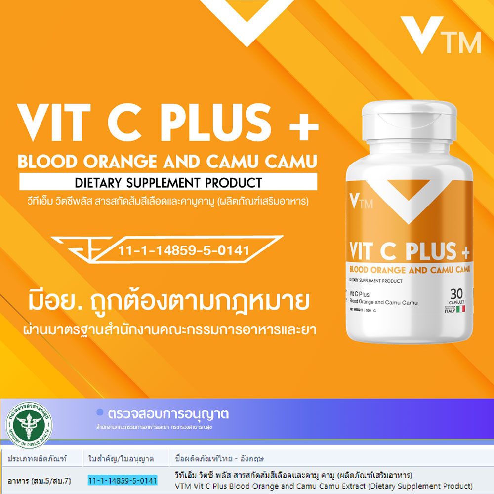 VTM Vit C Plus Blood Orange And Camu Camu Extract 30 Capsules ผลิตภัณฑ์เสริมอาหาร วิตซี พลัส สารสกัดส้มสีเลือดและคามู คามู อุดมด้วยสารสกัดส้มสีเลือด ที่นำเข้าจากประเทศเบลเยี่ยม และสารสกัดจากคามู คามู ที่เป็นเป็นผลไม้ Super Fruit
