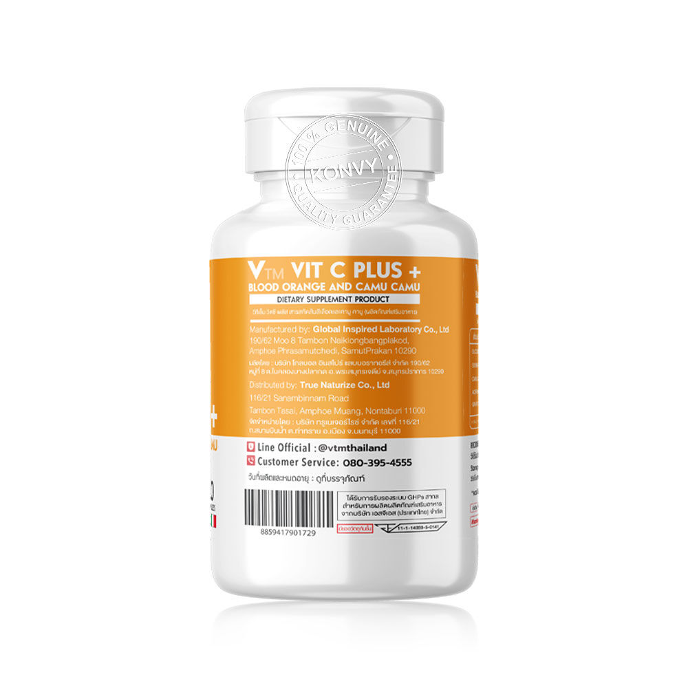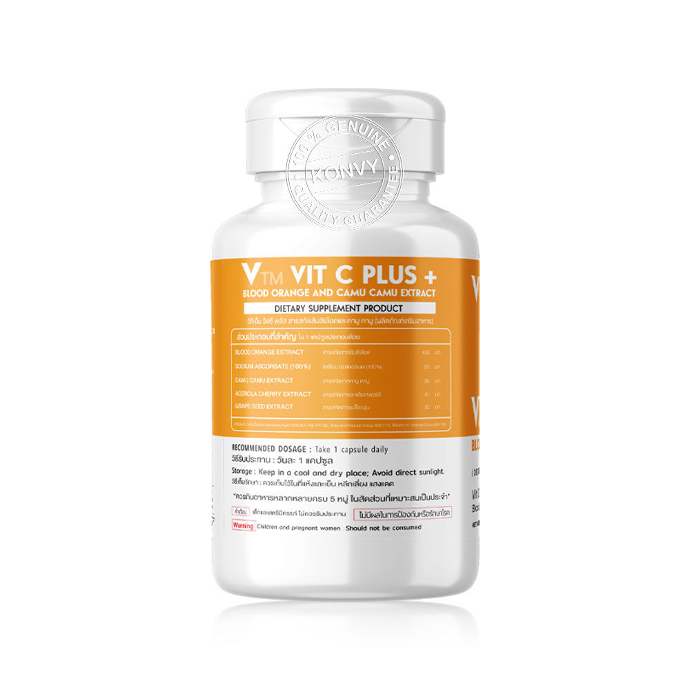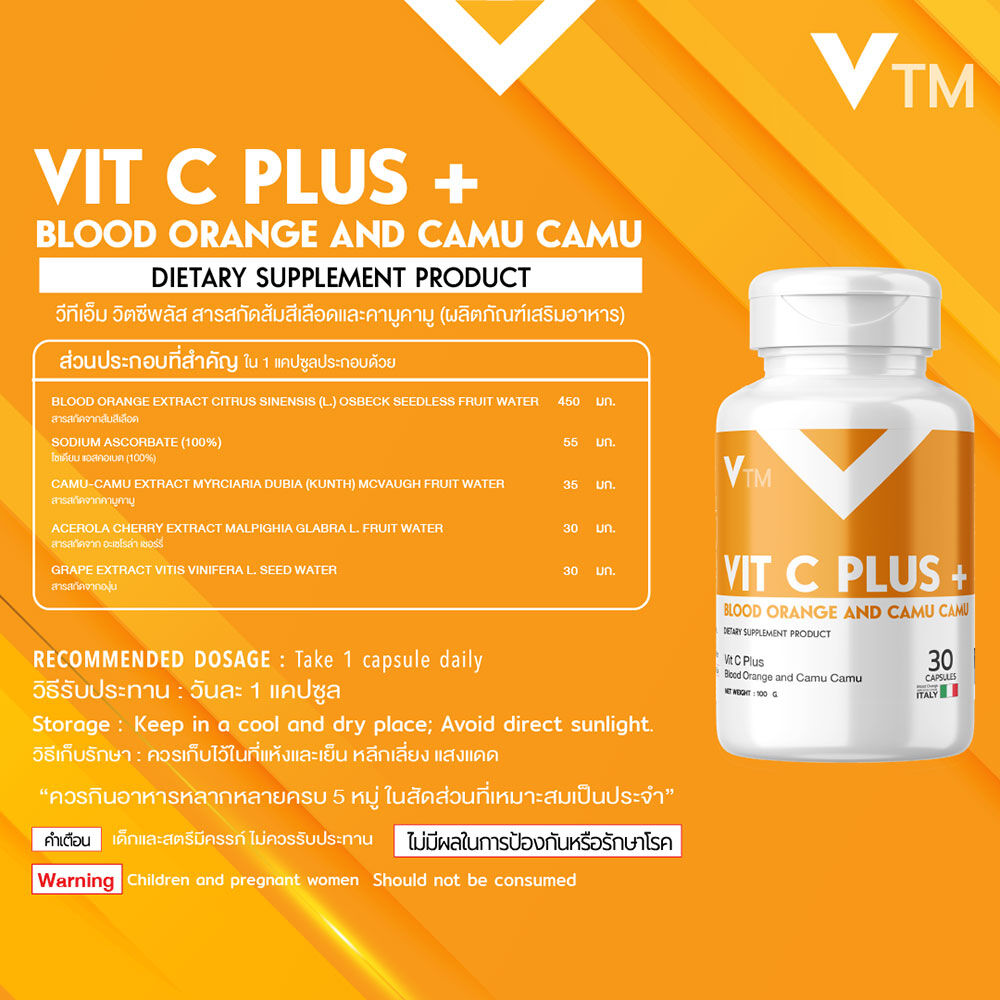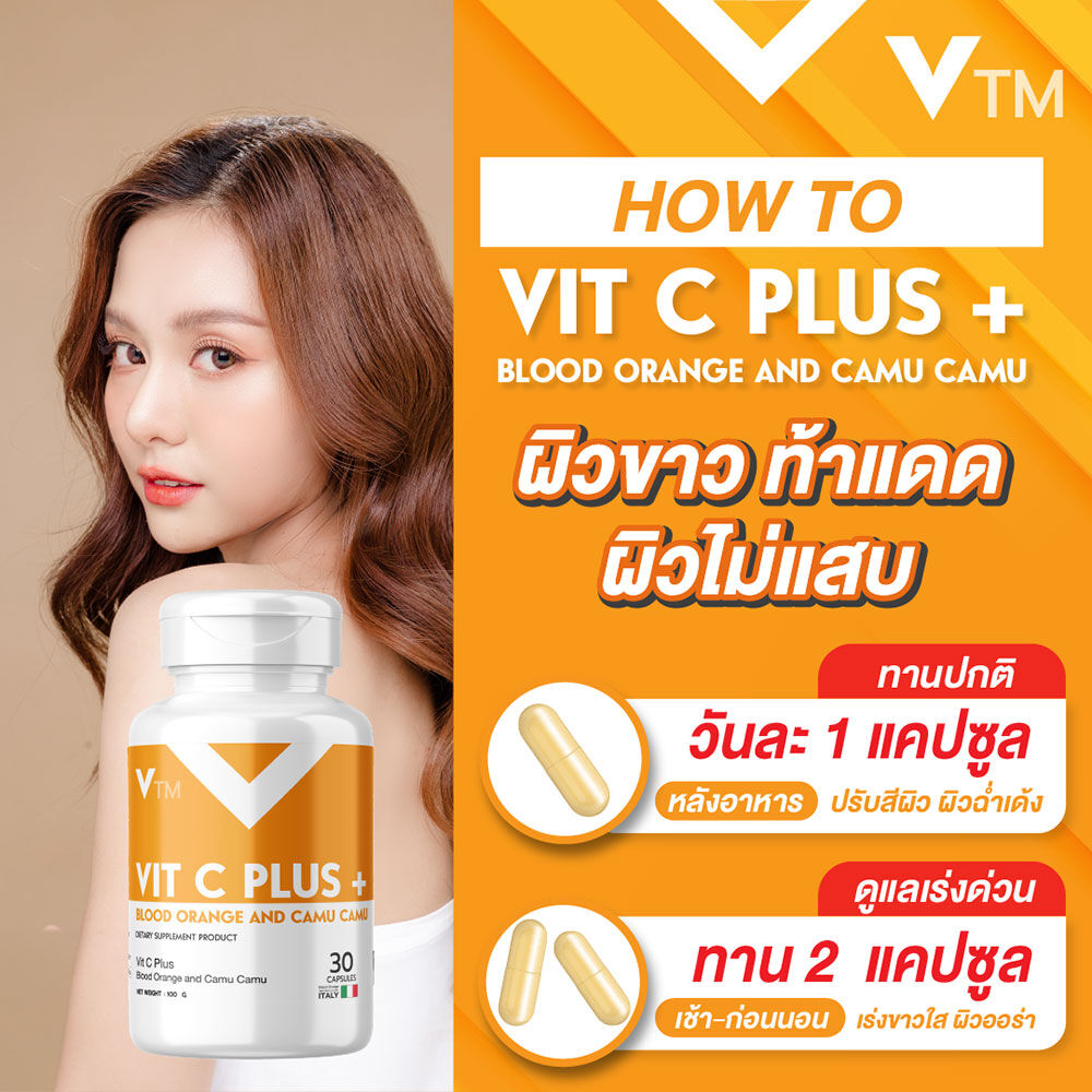 VTM Vit C Plus Blood Orange And Camu Camu Extract 30 Capsules ผลิตภัณฑ์เสริมอาหาร วิตซี พลัส สารสกัดส้มสีเลือดและคามู คามู อุดมด้วยสารสกัดส้มสีเลือด ที่นำเข้าจากประเทศเบลเยี่ยม และสารสกัดจากคามู คามู ที่เป็นเป็นผลไม้ Super Fruit