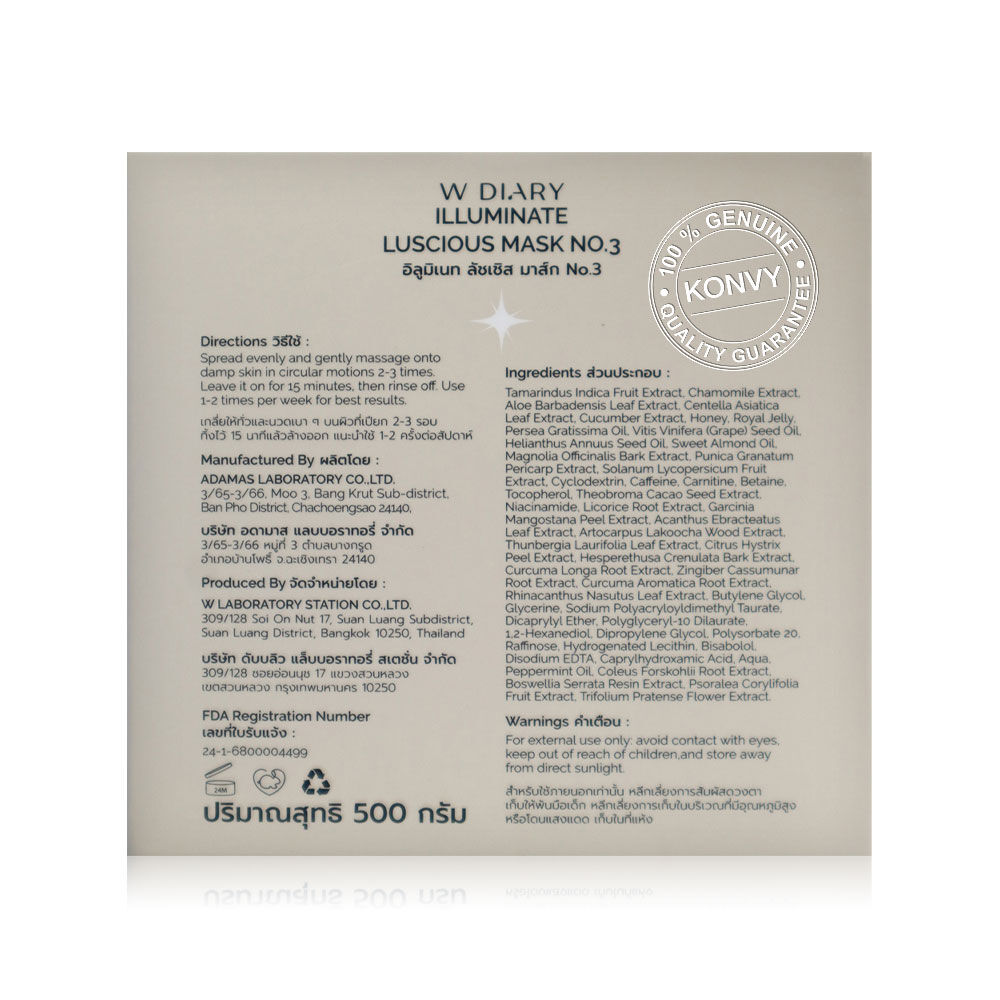 W diary Illuminate Luscious Mask 500g มาสก์เนื้อเจลลี่ ช่วยเติมเต็มความชุ่มชื้นอย่างเข้มข้น ฟื้นบำรุงและปลอบประโลมผิวที่อ่อนล้า ลดความแห้งตึง พร้อมคืนความสว่างกระจ่างใส ลดหมองคล้ำ ลดจุดด่างดำ ให้ผิวแลดูอิ่มฟู และมีชีวิตชีวา มีออร่า