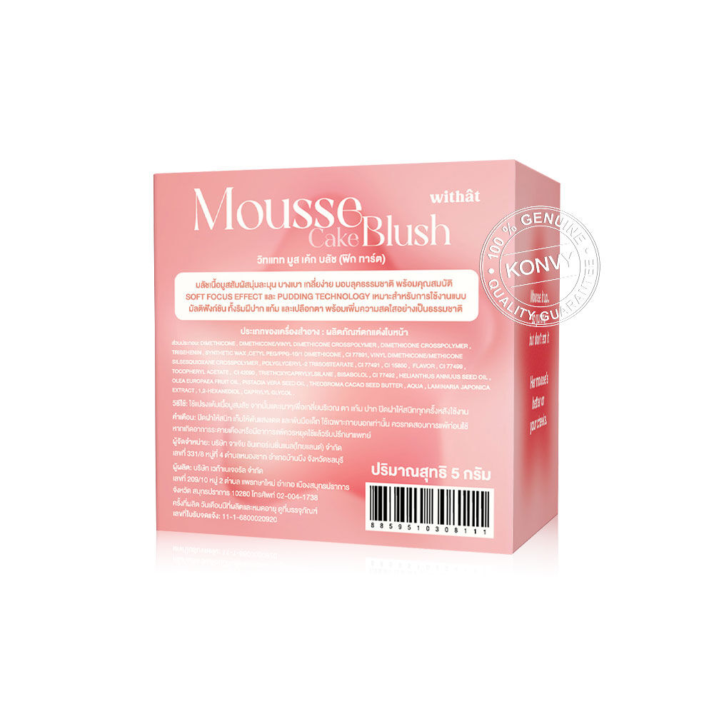 withat Mousse Cake Blush 5g #MB06 Fig Tart บลัชเนื้อมูสเนียนนุ่ม เกลี่ยง่าย ไม่เป็นคราบ ด้วย Pudding Technology พร้อมคุณสมบัติในการเบลอผิวสวยได้อย่างไร้รอยต่อ ด้วย Soft Focus Effect ให้สีละมุนดูเป็นธรรมชาติ สามารถใช้ได้ทั้งตา แก้ม ปาก