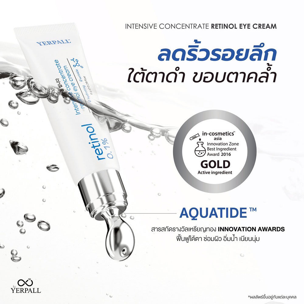 Yerpall Intensive Concentrate Retinol Eye Cream 8g ผลิตภัณฑ์บำรุงผิวรอบดวงตา ด้วยพลังสารสกัดจากสาหร่ายแดง ช่วยฟื้นฟูผิวให้แลดูมีชีวิตชีวา ลดความหมองคล้ำใต้ตา ด้วย Peptide และ Aquatide™ สารสกัดที่ได้รับรางวัล In-Cosmetics ปี 2016 ให้ผิวรอบดวงตาชุ่มชื้น อิ่มฟู เผยผิวที่ดูสดใสและเรียบเนียน